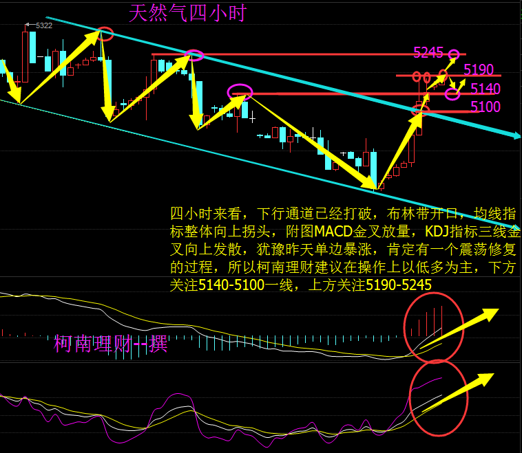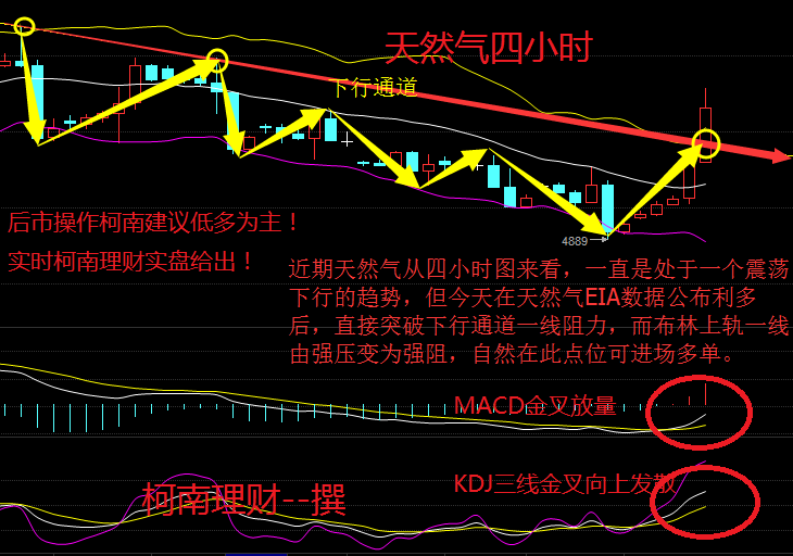 柯南理财: 原油天然气利多暴涨,晚间实时解套! 天然气日内震荡上涨,晚间EIA数据前在5050附近多空对峙,随后EIA数据大幅利多,天然气短线上涨100多点,如果有喜欢赌的投资朋友可能在此点位做了空单而且没有带止损,那么目前是亏损比较严重的。 从目前走势来看,回调的迹象不是很大,后市高位盘整为主。仓位比较重的朋友止
