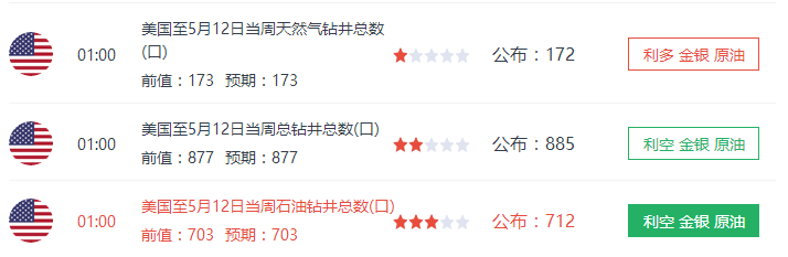 5.15早评:黄金原油天然气走势分析及操作建议 消息面: 原油天然气: 北京时间周六(5月13日)01:00公布的美国至5月12日当周的石油钻井总数为712口,连续第十七周录得增加,前值为703口。按照目前美国能源产业的生产效率,可以在1-3个月内形成接近41.91万桶/日的产能。其中因气温变暖,天然气的需求减少,天然气的钻井减少