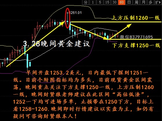 財贤狼:3.28晚间黄金低位做多!空单如何解套? 技术分析 早间开盘1253.2美元,日内最低下探到1251一线。目前个附图指标均为多头,目前现货黄金区间震荡,晚间重点关注下方支撑1250一线,上方压制1260一线,晚间財贤狼老师建议在此区间高估低渣,1252一下均可进场多单,止损带在1250下方,目标上看1258-1260.晚间即时行情建