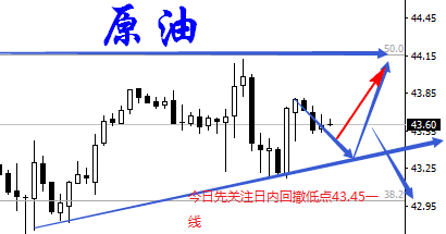 文/雅蕊话金(微信:yarui028) 原油周二探底回升。下探43.05守稳。美盘快速拉升收复日内下跌口,尾盘一度二次确认43.47.最终还是守稳低点之上走反弹。日内由于时间盘整长。没有走出一波单边的下跌趋势。拖到美盘力度不足。反升收复阻力。使得日图转阳。 日图阳线实体较大。配合前几个交易日的底部整理。使得43.0一带支撑做