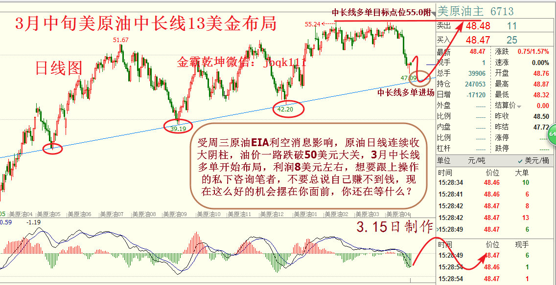 市场分析: 文/雅蕊话金/yarui028 2017年3月14日,美油4月期货下跌0.68美元/桶或1.4%,报收于47.72美元/桶、连续第七个交易日走低;布油5月期货下跌0.43美元/桶或0.8%,报收于每桶50.92美元、连续第六个交易日走低。由于OPEC月报显示沙特2月产量提高,因此即使OPEC减产履约率逾100%也无济于事。周三(3月15日)04:30,美国