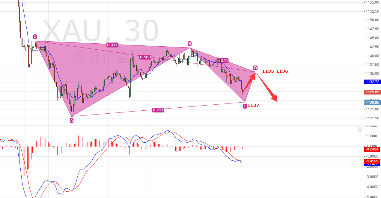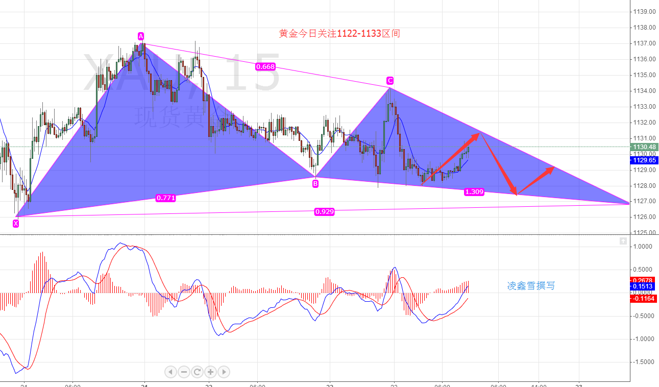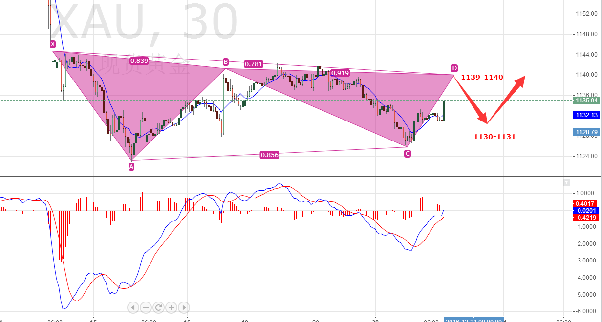 金银进入震荡,金关注1130-1145区间 周三(12月21日)亚欧时段现货黄金震荡微跌,目前交投于1133.99美元/盎司,短线来看,金价在1130美元附近开始企稳,但鉴于美元指数仍在十四年高位附近,而且市场预期美元有望继续冲高,金价下行风险依然存在。 凌鑫雪分析,我们看到走势非常动荡,金价受到美元走势推动。黄金只是在下次大