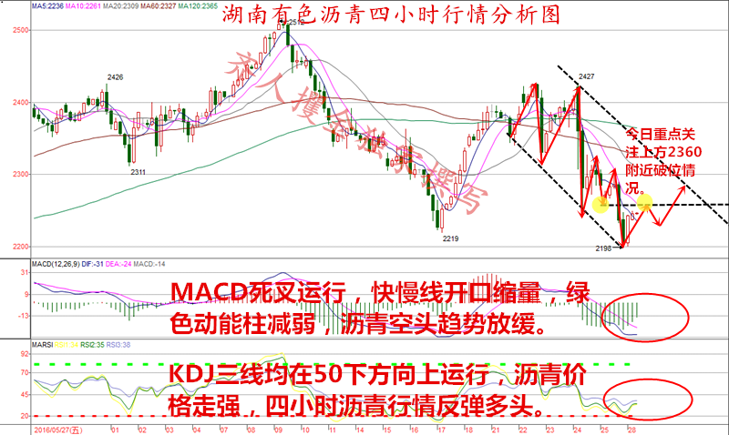 6.28湖南有色沥青行情分析: 沥青方面,从四小时图来看,K线从上周三(6月22日)2247附近,一路震荡向下运行,均线系统全线向下散发,MA5下穿MA10,附图MACD死叉运行,快慢线开口缩量,绿色动能柱减弱,空头趋势放缓,技术指标KDJ向上发散,沥青价格走强,四小时沥青反弹多头,今日重点关注上方2360附近破位情况,在操作尽