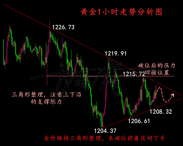 周二的操作很明朗,分析中也有详细的给出。每一次的操作我们都是有理有据,经过深思熟虑的出来的。昨天的行情就很简单再结合今日的分析图我们就能够很明显的了解到为何会有这样的一个走势,三角形的上下沿发挥了一个很有效的作用。那么我们操作上也不能逆势,顺势而为;支撑阻力按照原则进行布局,区间判定,剩下的就是在区间内高沽低渣的过程。今天来 レ,亻言xyh1866 看周二的行情也证实了我们的思路是没有问题的,操作上也必须给力。来回四单,昨日已公布三单,今天早间提醒午夜剩余的多单在1214附近全部离场,四单近20点的利润。周二的行情算是有史以来比较好操作的震荡行情,并且有4-5点的行情,操作自然不