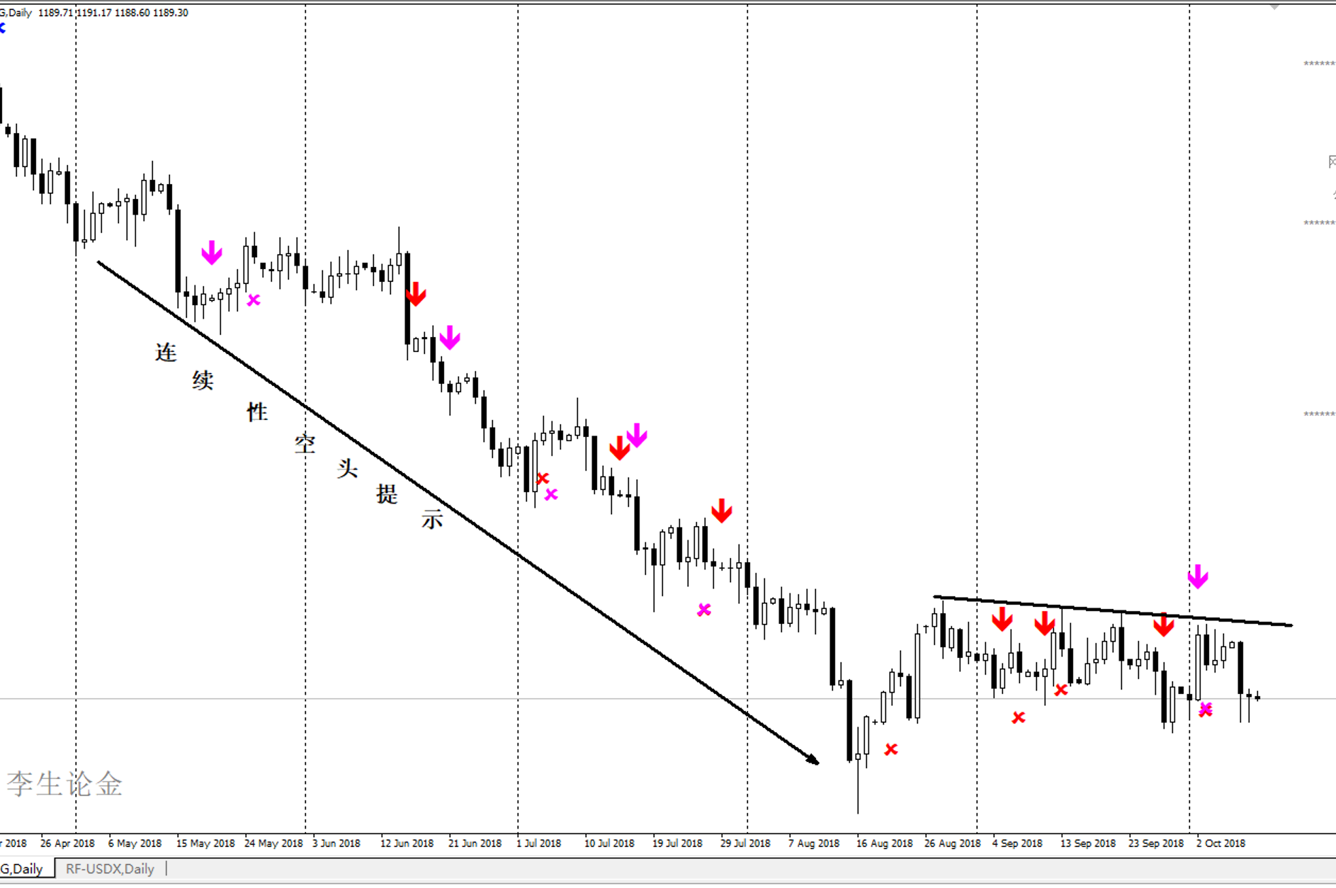 再长的路,一步步也能走完,再短的路,不迈开双脚也无法到达。成长的过程中,知道自己要什么,比现在干什么更为重要,做一件事情的过程可能漫长,但只要坚持,结果总会让你满意,交易中最难的其实也是如此,风险往往来自于不知道要干什么。 近期,黄金在 1190-1210范围内持续震荡了有一段时间,终于,在昨晚破位了震荡区间下轨的位置,从1198到1181,打破了许多人对多头的期待,如此弱势的走势,也意味着黄金很可能还将延续之前的下跌趋势,继续向下挑战更低的点位。 口诀:亚盘下跌欧盘延续,美盘前反弹是诱多,昨晚,李生论金口诀分析系统正式和大家见面了,不少之前申请了试用的朋友,第一时间就已经安装试用,