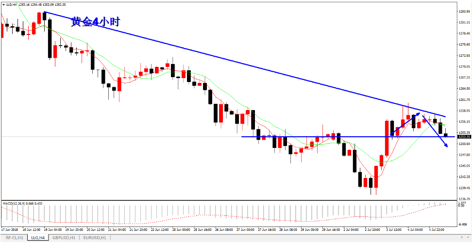 美国独立日假期休市,市场交投相对较为清淡,美元受到获利回吐盘打压,呈现回调修复的走势。德国分裂危机解除,还有市场对贸易紧张局势的关注度降低,部分资金开始流入除美元之外的风险货币,这些也是促使美元回落的原因。 亚洲盘时段,美元延续弱势走势,黄金则强势试探1260上方,但上行的区间相对较为有限。黄金冲高小幅回测1255一线,再次测试1261无果,承压后小幅回调,暂时处于1255附近呈窄幅震荡格局。黄金如早盘预期走势相同,急涨的行情还是欠缺延续性。 原油隔夜走出V型反转,基本收复之前的跌幅。亚盘时段,处于74.60/74.65区间高位窄幅盘整,波动的区间极其有限。之后,打破窄幅盘整走势,5日与10