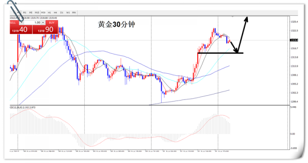 所谓老师,就是能让别人一直对着电脑既欣赏又信任,偶尔有种想透过屏幕给个拥抱又不敢声张的冲动!尤其是在止盈的时候。市场不会让人害怕,害怕的是不少人入场之后等待那种未知的时候。 一次,避险性买盘不断推高金价,刷新了1326的高点附近,价格偏离均线位置较远,在昨天早间横盘之后向上突破,1318果断入场多单目标给到1