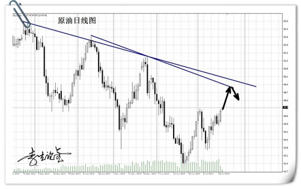 今天,油价表现强势,继续回踩之前的低点位置,经过反复的整理之后迎来了刚刚的上升,原有合约价格到了46.5,新合约到了46.7的高点,向前高点挑战! 油价,自这一波的反弹以来,出现了两次日线级别的收阴,而单阴的K线在上升行情当中不起到决定和反转信号,需要后面的K线配合,单根阴线的下跌只能看作上升行情当中的缓冲而已