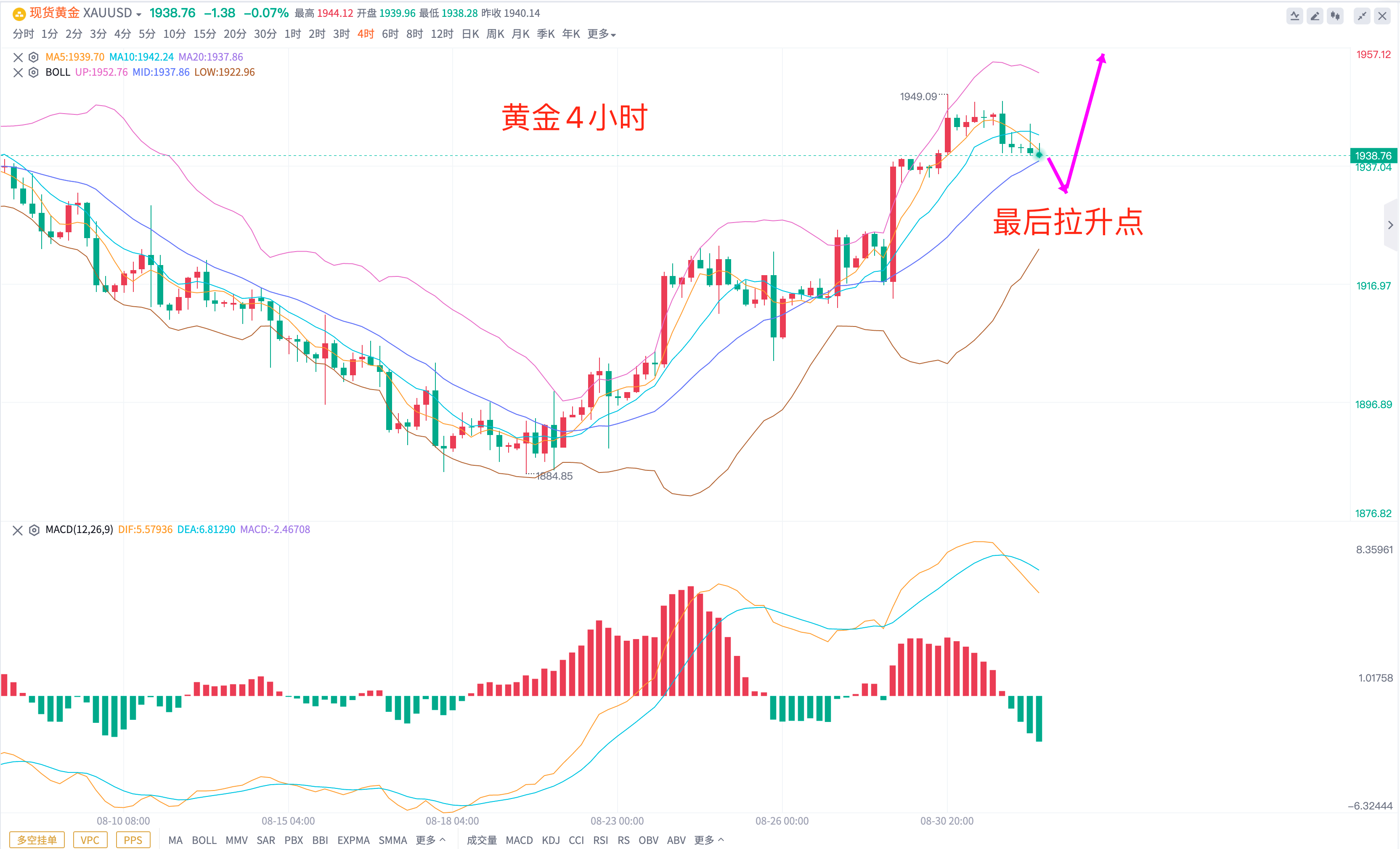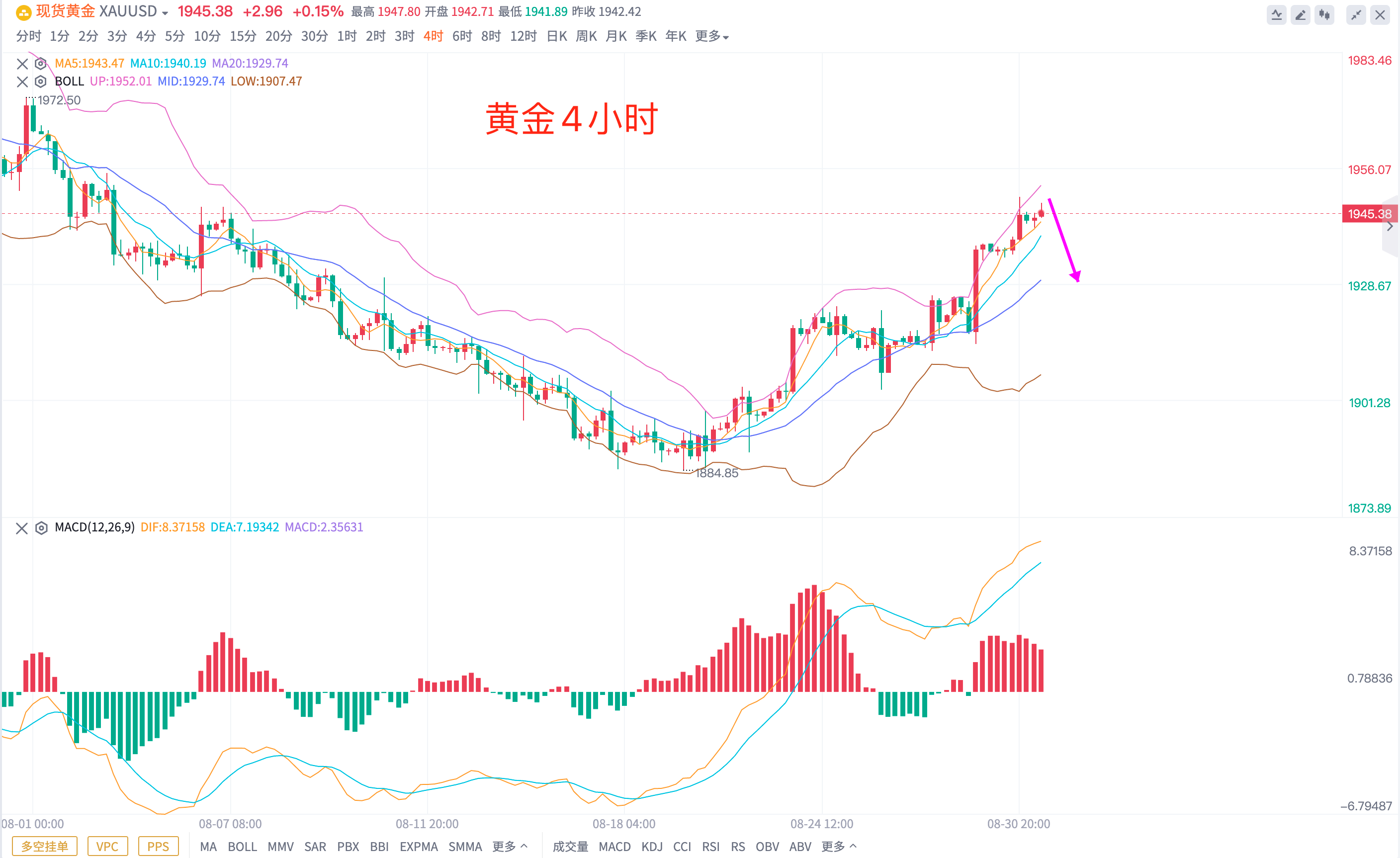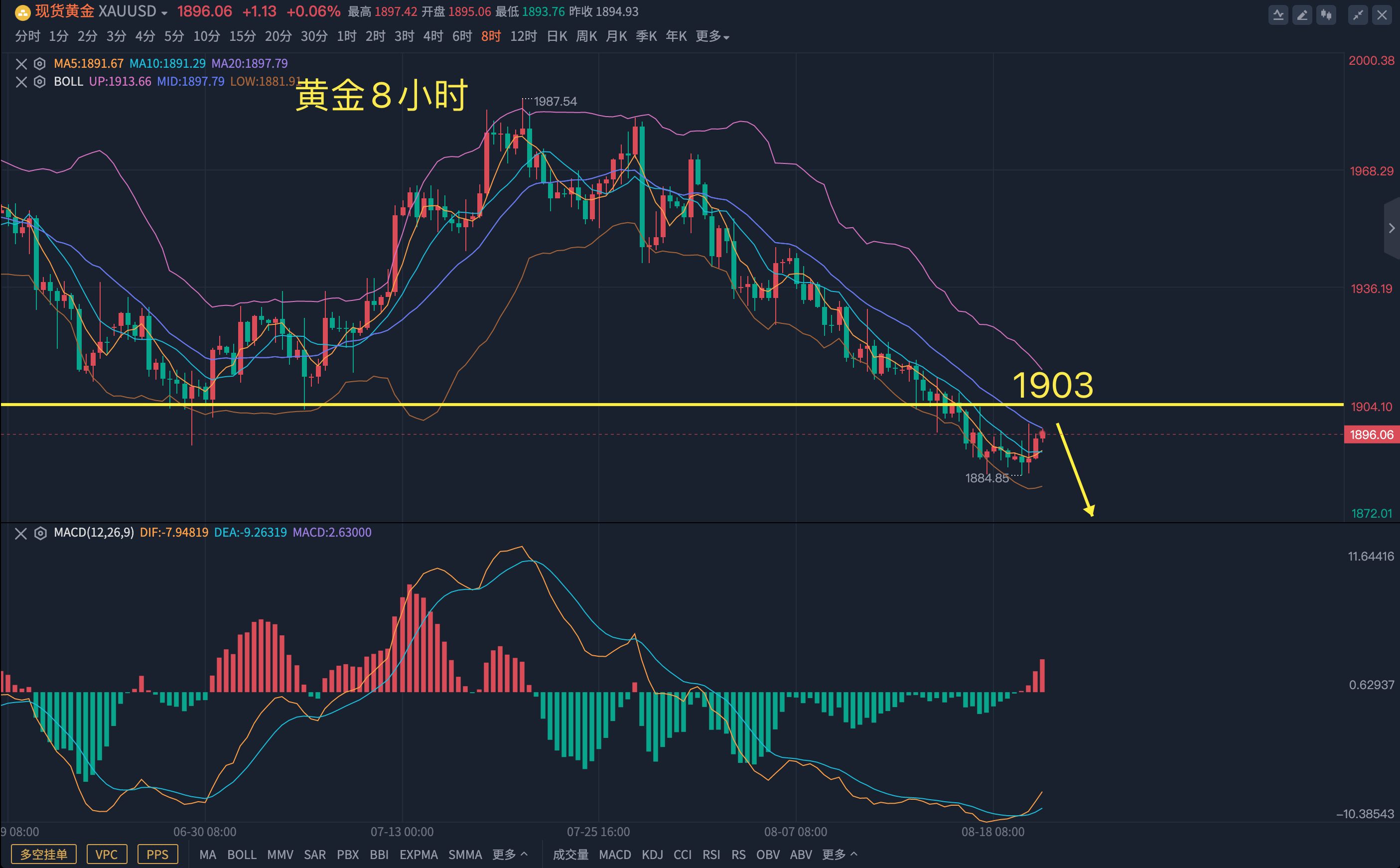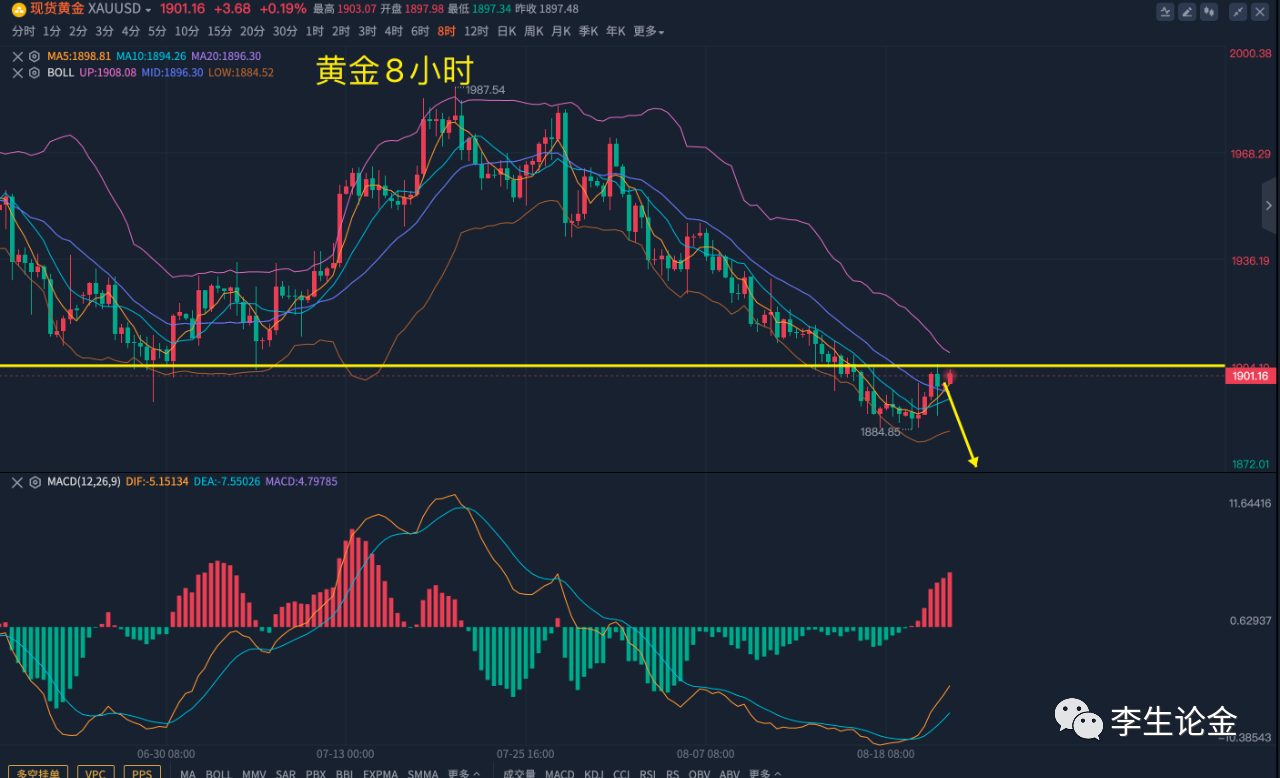 烂泥扶不上墙,会不会累死扶墙的?8月25日,北京时间22:05,美联储主席鲍威尔将在杰克逊霍尔全球央行的年会上讲话 了,连跌四周的黄金,难道在等鲍威尔这位“救世主”? 七夕节,市场还是很暖心,没有大的波动,让大家有个好心情与爱人共度良宵,金价一直卡在1900附近徘徊,给多空足够遐 想的时间,这已经是震荡的第三天了,金价是在此绝地反击,多头闷杀空头,还是就此断崖下跌,将抄底者一车带走,仍是悬念。 必定,搞交易又不是搞迷信,不是桥底下算命,也不是亢龙有悔或潜龙勿用看下卦象和爻辞,激励是没用的,只有等,等行 情的突破,等鲍威尔8月25号晚上的讲话,等暴风雨的到来。 上周,症状国商务部数据显示,7月