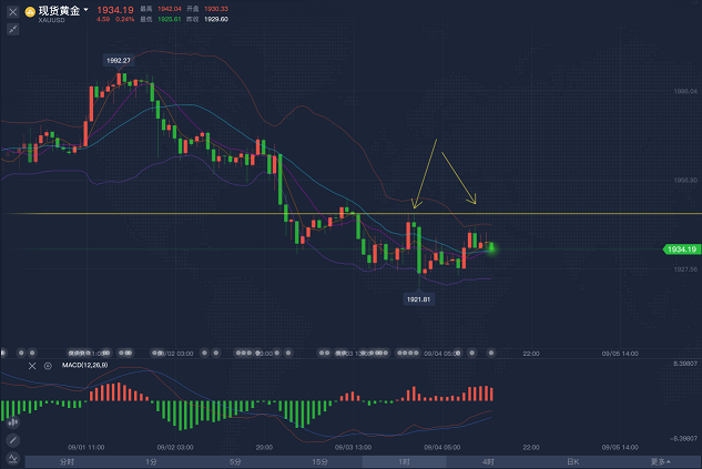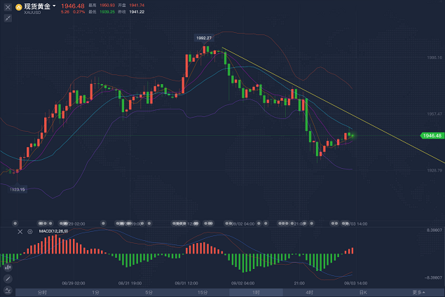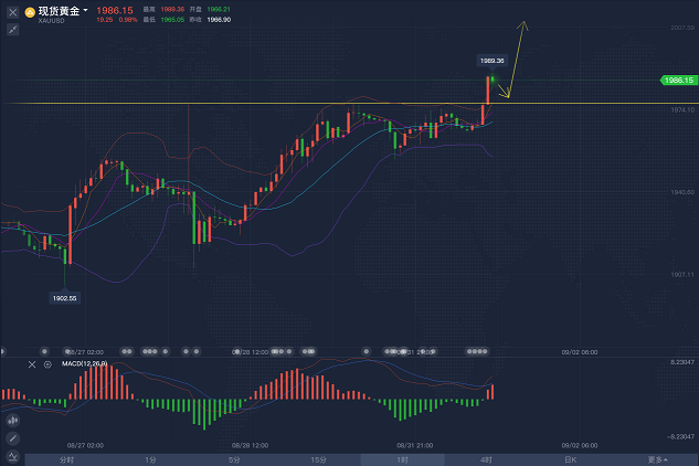 方法不对,努力白费,方法找对,事半功倍,凡事皆有法,找到好方法是成功的一半。不是题没答案,只是没找到方法,也不是路已到尽头,是该转弯了。学习优秀,你就是别人的风景,学习落后,别人就是你的风景,不要总是等待,也不要永远期待,交易就是勇于坚守,敢于面对,而不是坐着幻想。 本周,黄金走了一波冲高回落,尤其周四金价1950为压力位置再次走弱,不过,这次的空单没有做上,本计划的就是个震荡来对待,亚欧盘并没有策略上的安排,到美盘的时候,看到1924-1925的支撑,才于1935附近参与了一次多单,这个单子虽然到了1945刚刚好止盈,但也是纯左侧交易。 美国,8月29日当周初请失业金人数,前值101.1万