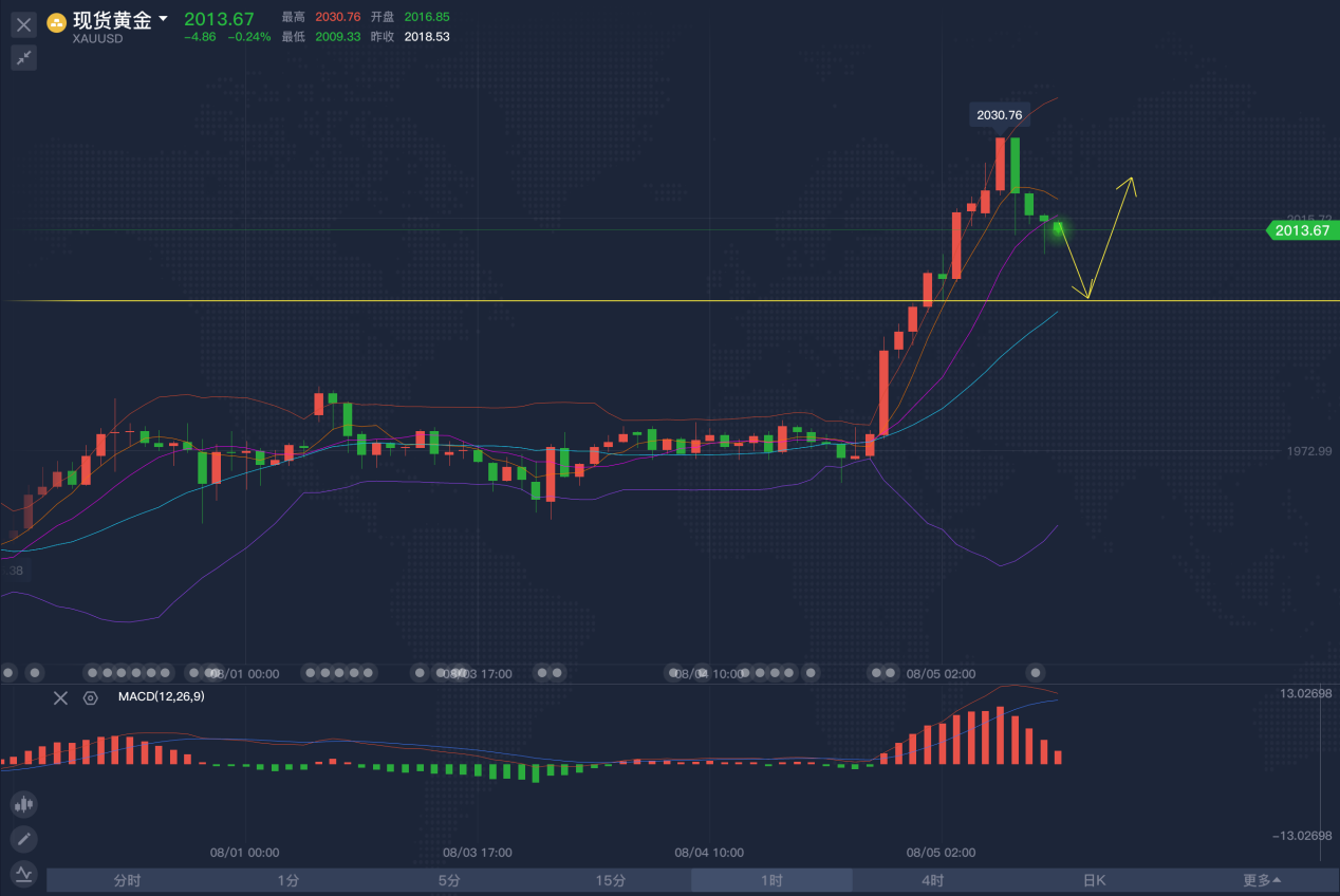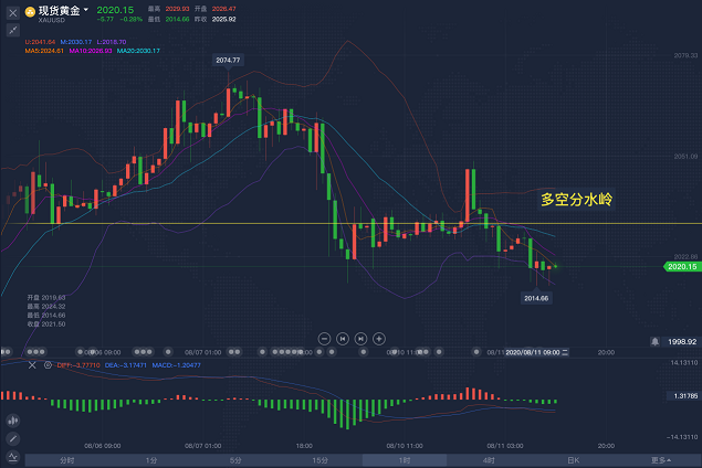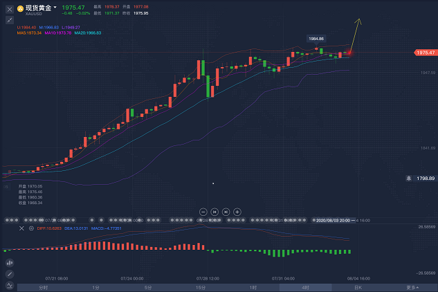 缘起,在人群中,我看见你,缘灭,我看见你,在人群中,人总是在接近单边的时候倍感刺激,在单边进行时却患得患失,人总会活成自己年轻时讨厌的样子,而交易也是如此,道理都明白,可依旧过不好这一生。 上周五,非农数据带动金价出现了久违的回落,也给市场的多头浇了一盆冷水,这一轮的上涨当中,几乎没有几个阴线,更谈不上连阴了,强势当中带着整个市场的气氛,而非农的利空不会太大程度的改变市场的方向,必定,现在美国的就业情况没有想象的那么乐观。 过去三周,都是金价加速上涨的过程,周线方面以及月线,并没有看到有调整的迹象,地缘风险不断的加剧,美国扩大对华高科技企业的制裁,美中之间的关系不断的恶化,欧美也是动荡不安,