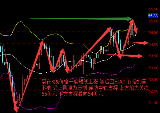 投资者需谦而不卑,骄而不横,敬而不畏。走过的是时间,看过的是行情,尝过的是盈与亏,回味的是得与失,沉淀的是经验,成就的是境界。机会总是留给有准备的人,但同样也留给会选择的人。顺势,市场造就你! 原油,从四小时图上看,目前K线价格交投于54.38美元,MA5/MA10均线交金叉运行,但仍然受布林上轨54.5美元的有效压