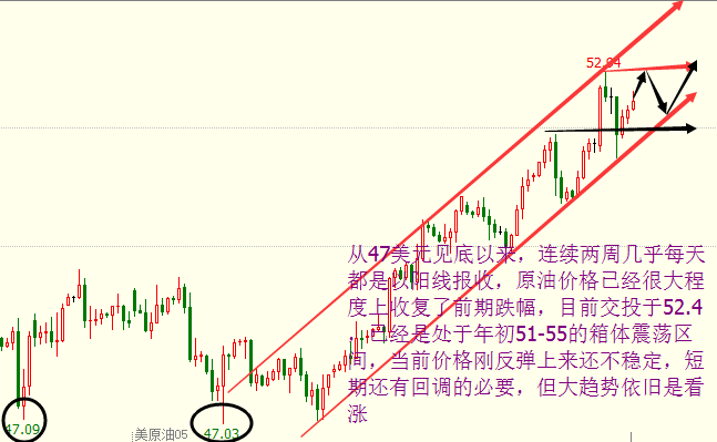 原油,从47美元见底以来,连续两周几乎每天都是以阳线报收,原油价格已经很大程度上收复了前期跌幅,目前交投于52.4,已经是处于年初51-55的箱体震荡区间,当前价格刚反弹上来还不稳定,短期还有回调的必要,但大趋势依旧是看涨,至少在1小时图上升通道没有被破坏之前是这样的。从小时图可以看出,良好的上升通道,并没有给