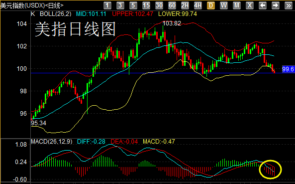 美元指数维持一个半月低位徘徊,从技术图上看,美指在周二跌破100关口后一路下行,短期价格受阻于布林带下轨,指标MACD动能柱体持续放量,双线向下运行在零轴下方,整体走势仍有潜在的下行风险,技术面加消息面对美元来说都不乐观。目前市场对美元未来走势预期偏向谨慎,而且美联储正更深一步地迈入升息的利率环境中,许多