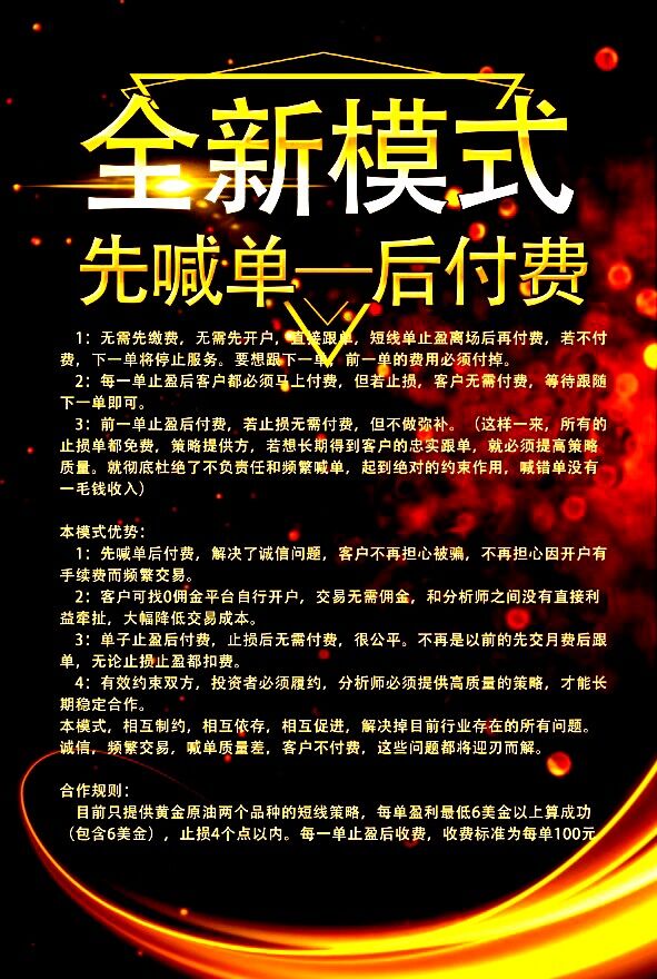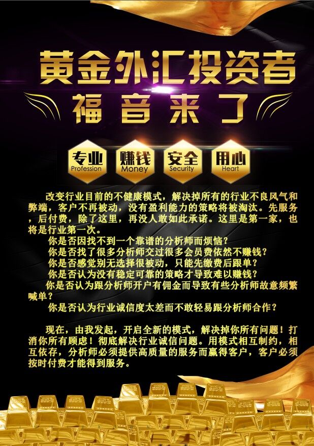 黄金外汇投资者的福音来了 改变行业目前的不健康模式,解决掉所有的行业不良风气和弊端,客户不再被动,没有盈利能力的策略将被淘汰。先服务,后付费,除了这里,再没人敢如此承诺。这里是第一家,也将是行业第一次。 你是否因找不到一个靠谱的分析师而烦恼? 你是否找了很多分析师交过很多会员费依然不赚钱? 你是否感觉别无选择很被动,只能先缴费后跟单? 你是否认为没有稳定可靠的策略才导致难以赚钱? 你是否认为跟分析师开户有佣金而导致有些分析师故意频繁喊单? 你是否认为行业诚信度太差而不敢轻易跟分析师合作? 现在,由我发起,开启全新的模式,解决掉你所有问题!打消你所有顾虑!彻底解决行业诚信问题。用模式相互制约,