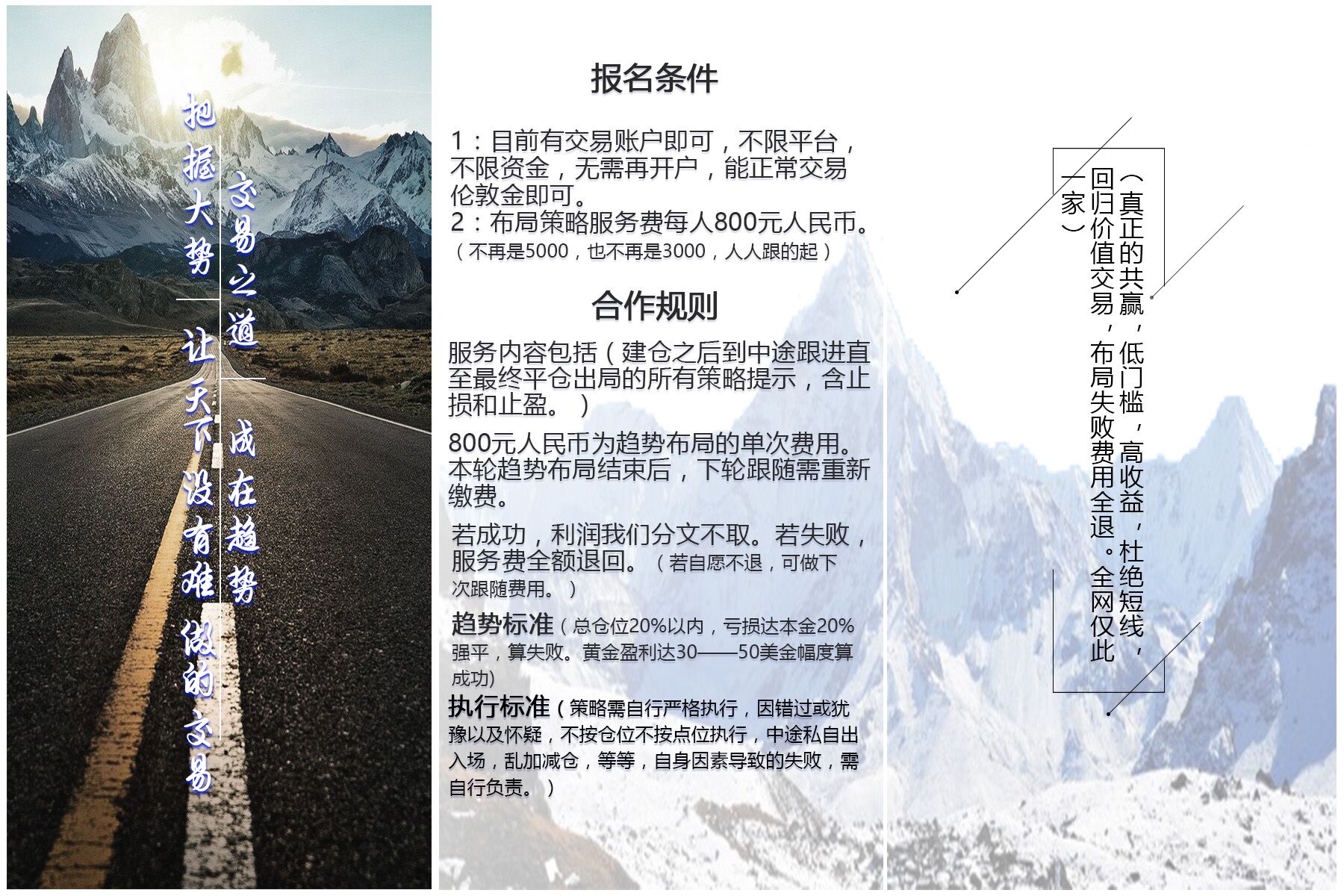 美联储决议公布之日,将是黄金行情破茧重生之时,对于近期的震荡,这一刻,等的太久了。不过,最后的最后,还是需要耐心,需要智慧,更需要勇气,每一次机会,都会悄无声息的来。而每一次机遇,都是留给有准备的人,时势造就英雄,趋势造就财富,对于趋势行情,不但需要眼光,更需要勇气。 美联储决议又一次到来,全球投资者为之紧张,为之准备,究竟是机遇还是陷阱,是起飞还是降落,市场为之争论不休。其实,在我看来,我们无需争论,只需尊重市场即可,任何情况下,任何事物,都有其局限性和极限性,所谓物极必反,就会峰回路转。美联储影响的是全球,不仅仅是一个品种,我们只需关注有把握的,有潜力的,并利用可控的风险去博取预期的收益