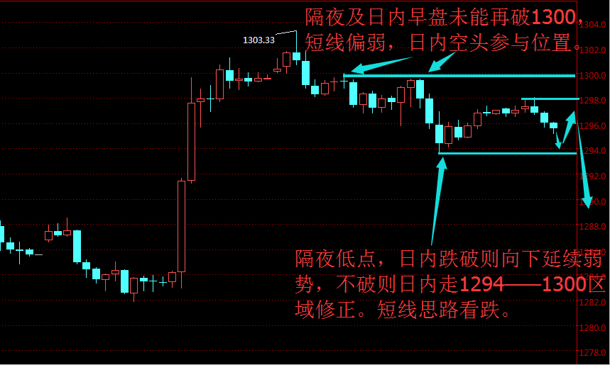 周尾看涨黄金的思路基本兑现,非农没有折腾出啥样子,黄金基本走势依然没有变,关键还是美元,美元受阻之后持续高位震荡偏弱,美元目前已经展开回落,而黄金上周多次试探 1280 —— 1285 的密集支撑区域,就是做多机会,也是不断测试支撑后确认支撑的过程。所以在上周的评论中,我多次讲到了黄金在 1285 —— 1280 区域做多的阶段性机会,上周不断提示 1290 下方建仓多单,目前建仓的多单继续持有即可。 日内短线来看,早盘自 1292 一线起涨,短线继续偏强,上周经过低位震荡蓄势盘整之后,本周就是多头发力的阶段,日内还是低多思路为主,震荡行情, 1300 就不是阻力关口,所以 1300 的短线