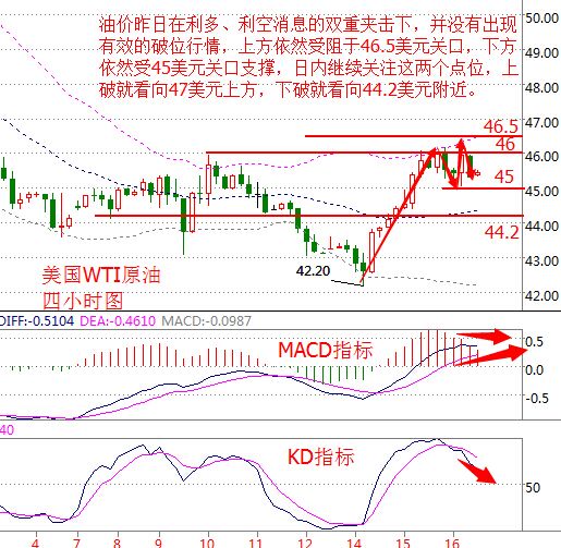 基本面分析: 周三(11月16日)美国WTI原油12月期货收跌0.24美元,或0.52%,报45.57美元/桶,盘中最高触及46.41美元/桶。布伦特原油1月期货周三收跌0.32美元,或0.68%,报46.63美元/桶,最高至47.56美元/桶。 虽然石油输出国组织(OPEC)正在积极协调各成员国之间的分歧,并展现出积极的限产迹象,但美国上周原油库存的再度大增