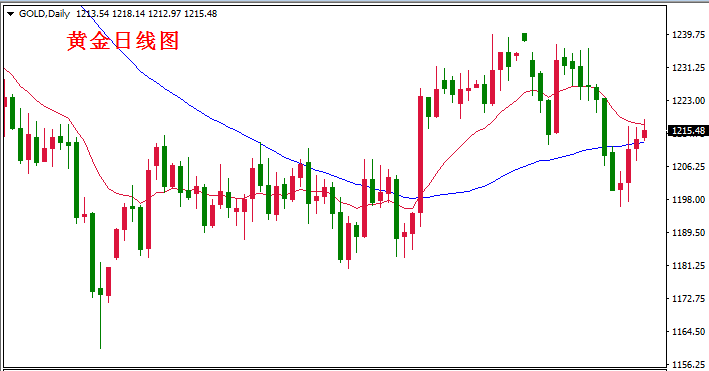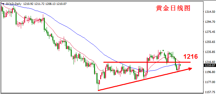 青云点金:11.16晚评原油今日不可空,黄金可做多! 【消息面】 今日美元指数持续低迷,指数97关口下方振荡,亚市黄金振荡上扬,午后黄金最高涨至1218.14美元/盎司,随后黄金有所回落,目前黄金在1216附近整理。 日内美元指数继续振荡回落,最低至96.76与昨日低点持平。黄金获得小幅上涨,但仍然受阻1218附近。今日亚欧市黄金表现为振荡上涨局面,但涨幅不大且没能跳出短期振荡区间,晚间美盘能否跟随欧市继续向延伸,仍然无法确定。另外,晚间关注美国数据的10月工业产出月率公布情况,估计对黄金波动有所影响。 【MT4黄金走势分析】 黄金日线图看,黄金仍然未能摆脱15日均线阻力压制,日内受到50日