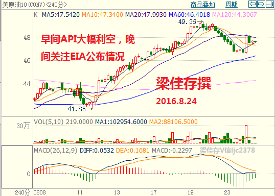梁佳存:API数据打压油价,8月24现货原油走势分析 在周一周二的行情大家也看到了和我上周给出的总体趋势大同小异,原油强势破位48.5美元,日线收大阴造成反转,白银低开回补不上,那么总体来讲原油反转,白银破箱体开始预备下行。那么原油是否可以抄顶了?给出中肯的建议是只做中线不做长线,为什么?原油大家都明白自下而