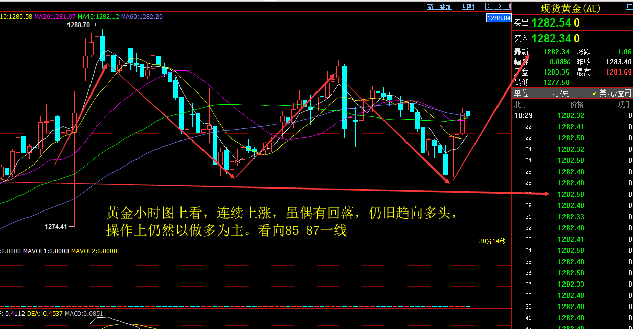 很多投资者一定有这样的经历:你做多,就跌;你空,他就涨;你一砍多,他就还涨;一砍空就跌。这往往使我们心态这一块的波动所造成的最直接的影响,心态发生变化,马上就凭借自己完全一窍不通的技术知识来对持仓做自己认为对的判断,最后结果往往是事与愿违! 黄金技术消息面分析: 周二(4月23日)美元全线走高,美元指数刷新2017年6月以来高点至97.78,因金融市场在复活节假期后重开,且交易商在周五美国公布首季国内生产总值(GDP)数据前青睐美元。金价跌至近四个月低点,因美元走强,且投资者寻求风险较高资产. 黄金从4小时来看,单边下跌后低位震荡;MACD金叉,反弹屡次试探顶底转换1280一线,未能突破,今