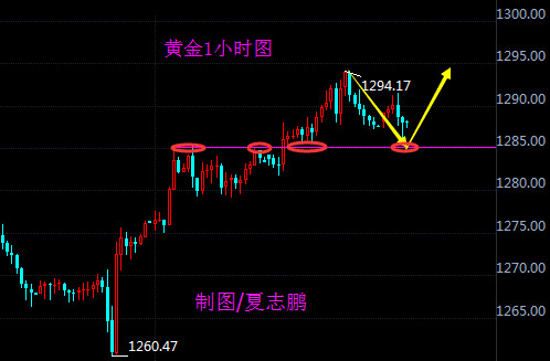 等待总是最熬人的,但好的行情大的利润大多数都是等待的结果,相对于今天的行情,早上1290的多单显得过于激进了,昨天日线收带有长上引线的阳线,就说明多头动能有所减弱,本想今天行情会借助剩余的多头动能在上冲一波,然后再展开回调整理,但是事实并不如预期,行情再小幅上冲1291遇阻后,便展开回调,对于手上1290多单的