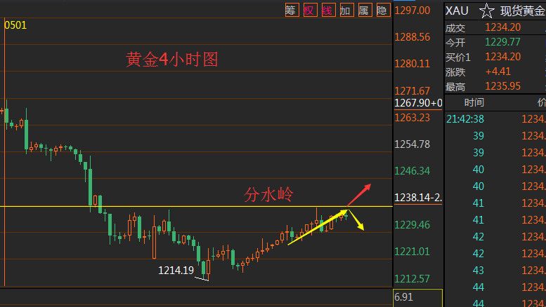 黄金10点不突破先看空,原油震荡上行低多不变 日内行情并没有大的波幅,截止现在,行情依然震荡,似乎现在日内走势,成了明显的鸡肋行情。 日内金价没有破位分水岭1237.5.也没有破位1230,维持在2美金区间波动。 4小时连阳不断,运行在均线上方,从形态上来说,这种形态,直接做多,行情没破高,预计冲下就回落,而直接