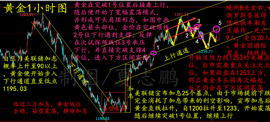 夏志鹏:黄金再上演过山车行情,原油遭受打压仍旧多 行情总是千变万化,而利润总是为那些有准备的人准备的! 黄金昨天的行情可谓是再度走出了一个V型反转,晚间受到ADP利空的影响,金价大幅跳水,一度试探前期低点1240一线的支撑。而后今天凌晨再度戏剧性反转,美联储再放加息言论,受此影响,黄金极速上扬,基本抹平了日内