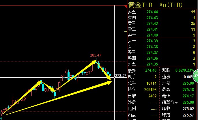 午夜金评:美指三连涨助黄金三连跌,后市272难保 周二(3月7日)黄金TD最终还是没能抵挡住空军的连番轰炸,在一片哀嚎声中,黄金TD跌破275关键支撑,在关键点位沦陷之后,金价进一步扩大跌幅到274元/克。而在周三开盘之后,黄金TD没有一丝停留,将跌幅再次扩大,截止午盘收盘金价录得273.54元/克。按照目前的行情趋势,今日晚
