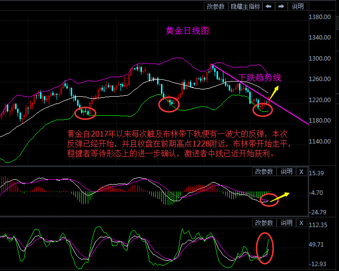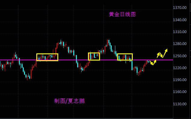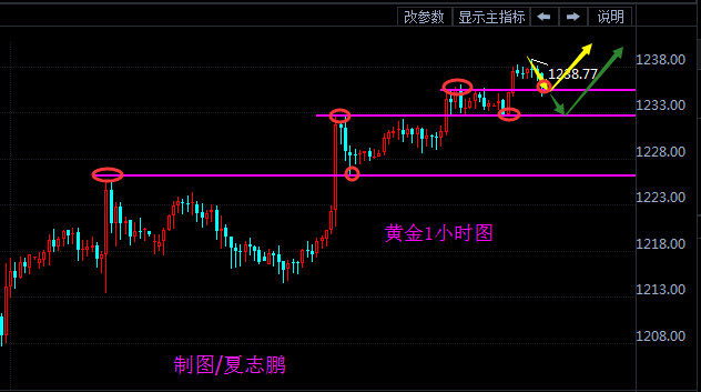 有些风景,需要有勇气攀越才能共赏!有些行情,需要你主动才能把握利润! 今日的行情并没有按照周评里预测的那样运行,而是早间开盘1228一线直接走高,最高触及1232一线受阻,按照周评的思路,黄金上破站稳1228一线,此线为重要的多空转换点,并且在周五一根实体大阳线的支撑下,本周开盘无论如何也要多一次。金价回落1226