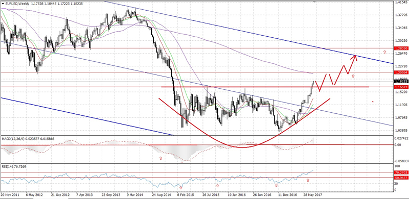 ~ 昨日涨幅最大的是欧元兑美元,收盘站上了1.18。从今年初进入上涨以来,欧元兑美元接连突破了重要的阻力位,目前已经突破了长达两年的区间震荡,现在的汇价是两年以来的最高点。欧元的汇价如此强势,再配合当前的基本面,特别是欧洲央行将结束宽松的货币政策,转而进入加息周期,欧美有望走出中长线的上涨。如果这样的判断