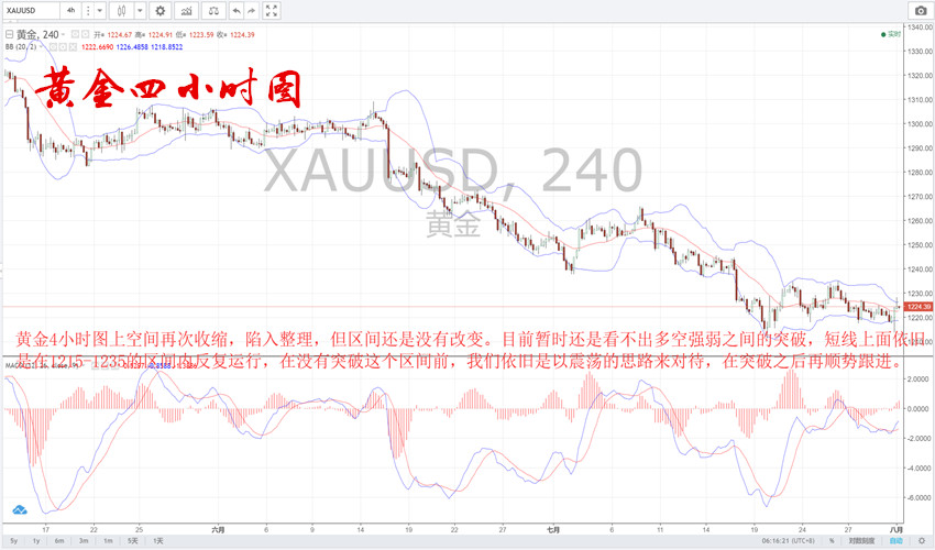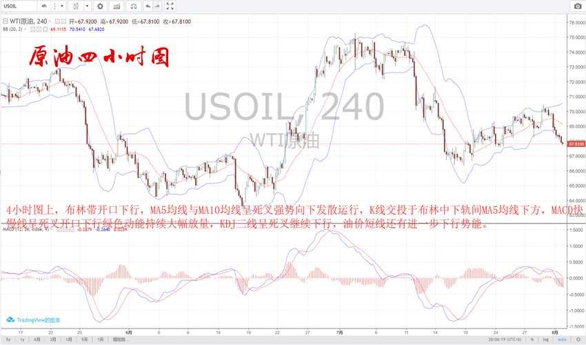 疾驰的快马,往往只跑两个驿亭,从容的驴子,才能日夜兼程,拿破仑曾说过“一头雄狮率领着的一群绵羊,会战胜一只绵羊率领的一群狮子”,面对行情的清淡往往被人们忽略,暴风过后才发现为时已晚,宁愿被别人优衣库的激情感染,也不愿为自己的投资用心,一个没有脱离低级趣味的人,不是一个纯粹的人,行情往往来自于大意,亏损常常来自于固执。 8.1原油行情分析 目前技术面来看,日图布林带三轨朝下缓和运行,MA5均线呈金叉拐头朝下运行,K线交投于布林中下轨之间,MACD快慢线位于零轴附近呈死叉再次开口向下发散绿色动能二次放量,KDJ三线交死叉强势向下发散运行,行情表现空头趋势; 4小时图上,布林带开口下行,MA5均线