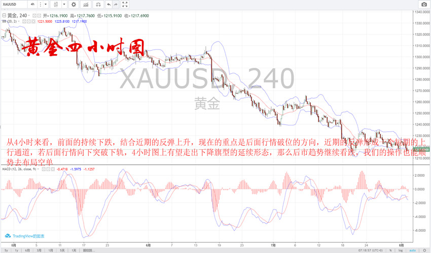 能够生存下来的投资,并不是那些最厉害的,也不是那些最聪明的,而是那些对行情作出快速反应的,同样的路,有人漫步,有人奔跑,有人驾车……方式不同,结果不同。 【8.8黄金行情分析】 技术面上,黄金昨日日线继续保持震荡下行局势,当前逼近1200大关进行低位震荡,且多空延续性差,呈阴阳循环走势。5日-10日均线连续形成死叉下行压制,当前5日均线与10日均线分别压制1216、1219位置,昨晚美盘反弹高位就是1216位置。而当前短期下行趋势线第一压力点就是1216位置,所以此位置是我们今日关注的阻力点,可依托此位置入空继续看下行。布林带下轨出现走平运行1203位置,这是一个好的迹象,起码没有延续性的向
