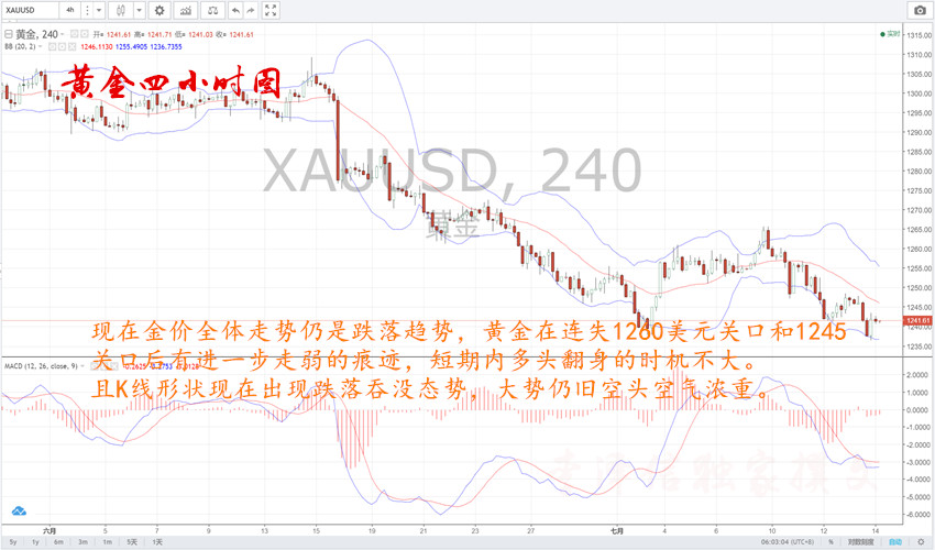 授之以鱼,不如授之以渔,大家早上好,我依旧是那个低调而有带你赚钱实力的李泽信。把自己的欲望降到最低点,把自己的理性升华到最高点,投资之路不平直,行情会有许多拐点处。没有拐不过去的点,只有拐不过去思路的人。遇到市场的拐点,学会给心灵松绑,想得开,悟得透,给拐点一个微笑。 7.17黄金行情分析 黄金日线图来看,上周金价维持下行趋势,上周初触及1267高点高点后震荡走弱,目前5日和10日均线已经死叉向下运行,而日K线持于布林带下轨支撑之上,布林带开口向下;从指标上看,黄金趋势仍然是偏弱势行情。日线上黄金图上有走出双底的迹象,前期金价的低点支撑在1236附近,上周五金价续跌再次测试了1236支撑,只
