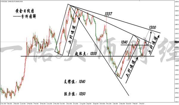 预测从属于主观,一切必须由市场来决定,市场永远是客观的,不以交易者的主观来决定的。跟着市场行动,抛弃任何主观的东西,是成功交易者的前提。市场上没有神,只有脚踏实地做实事,错误并不可怕,只有不断提炼和完善自己的交易系统。 黄金: 本周黄金延续上周多头趋势,但整体走势偏弱势,除周二美总统特朗普医改未通过使