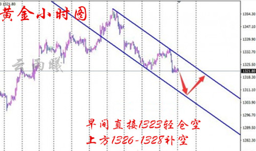 相识是缘,相知则是份。时光流逝,缘起赢生,新的开始。相信能,我们就能!成功从信任开始。 黄金昨日短区间震荡,一直没有下手的机会。4小时图上,布林带朝下张口扩大,价格运行在布林带下轨一线,MA5日均线在1325一线强势下穿10日均线形成死叉向下运行打压价格的上涨,指标上快慢线死叉下行,绿色动能柱放量明显;综合以上,