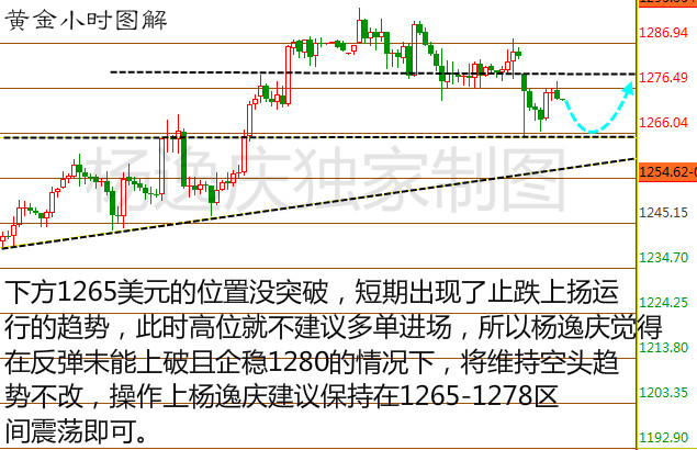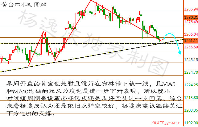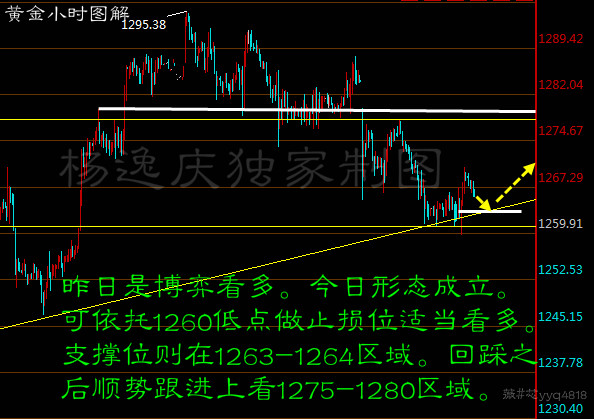 昨天受到美元指数的下挫导致黄金短幅的上涨,或许好多投资者都把握到了这波行情,杨逸庆也是准确的把握到了这波行情,盈利达到8个点,那么请问你把握住了么?没把握住,那原因是什么呢?或许有的朋友看到黄金近期的走势是跌跌不休的,然后就最近两天可能做了空单进去了,然而行情又不给力的止跌于1260一线反弹至1263一线