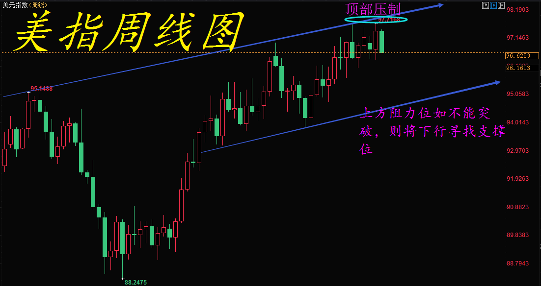 在担忧全球经济放缓之际,投资者正等待美联储本周会议提供更多升息线索,美联储本周料将无视特朗普的批评继续加息。黄金价格回升。上方受到密集均线形成的1243压力位的压制,短期受到这一平台的反压,短线无法有实质性的突破,随着美联储决议的临近,料将金价会再次回落。 美指当前从19个月高点回落,加息落地若不能助长美指上行,突破年内高位97.72,这个位置是2017-2018年下行区间的61.8%回撤位,因此对于美元而言是一个重大阻力,三顶的压制短期内相信会在此处构建顶部并在2019年在此处下方回调修正。 另一方面市场若是12月加息的落地,那么美联储主要利率区间将成为2.25%至2.5%。利率将因此来到