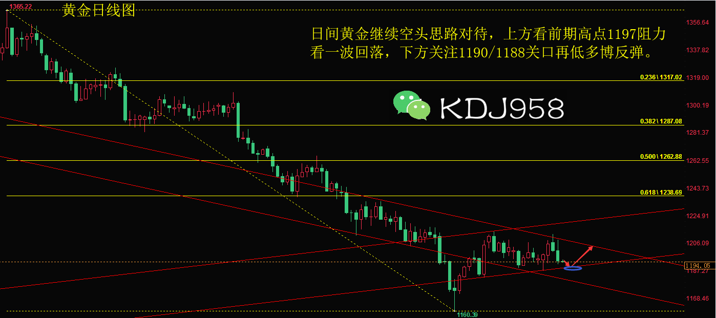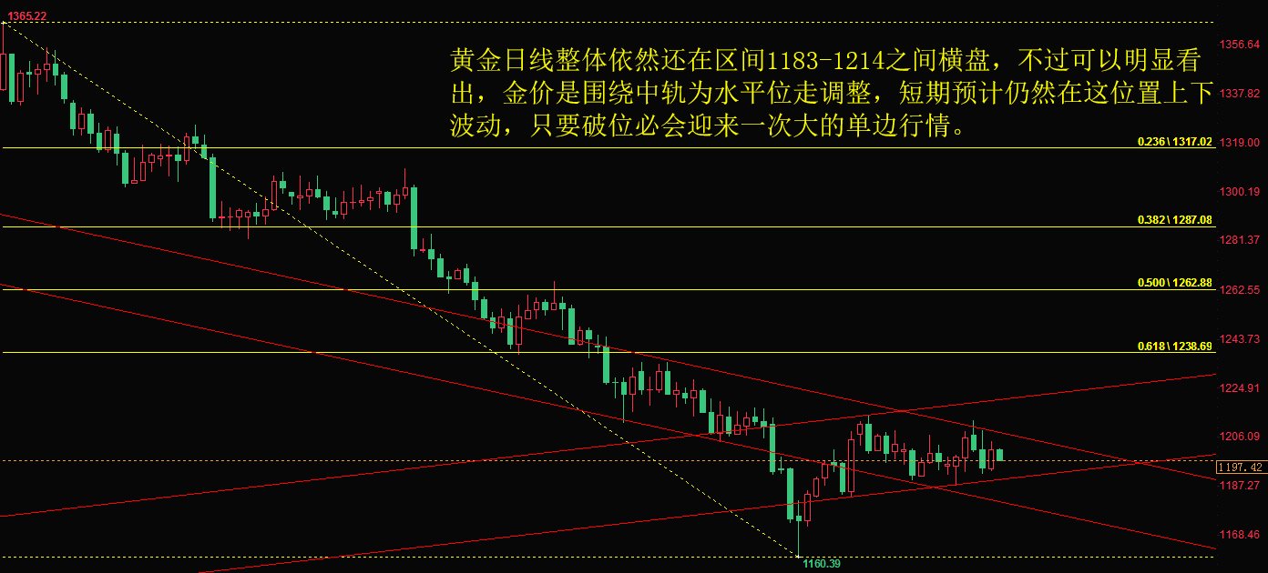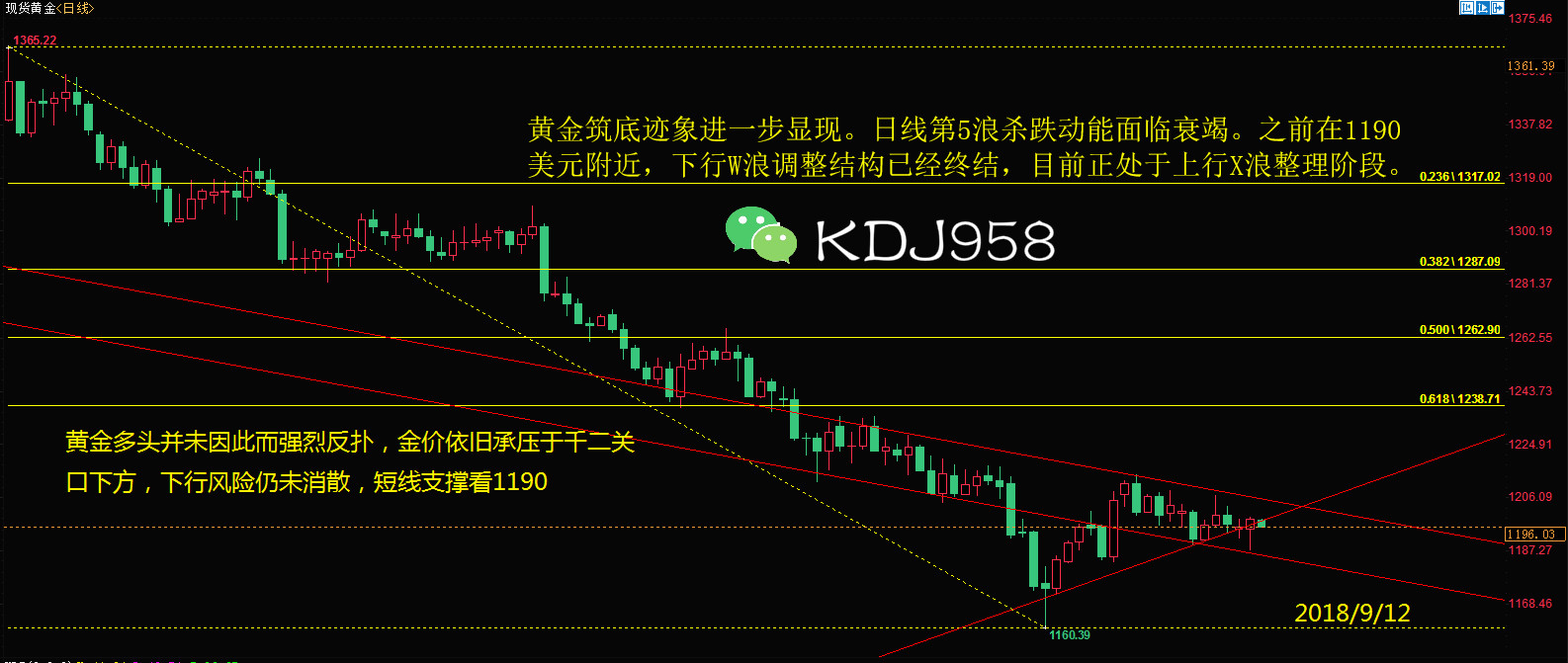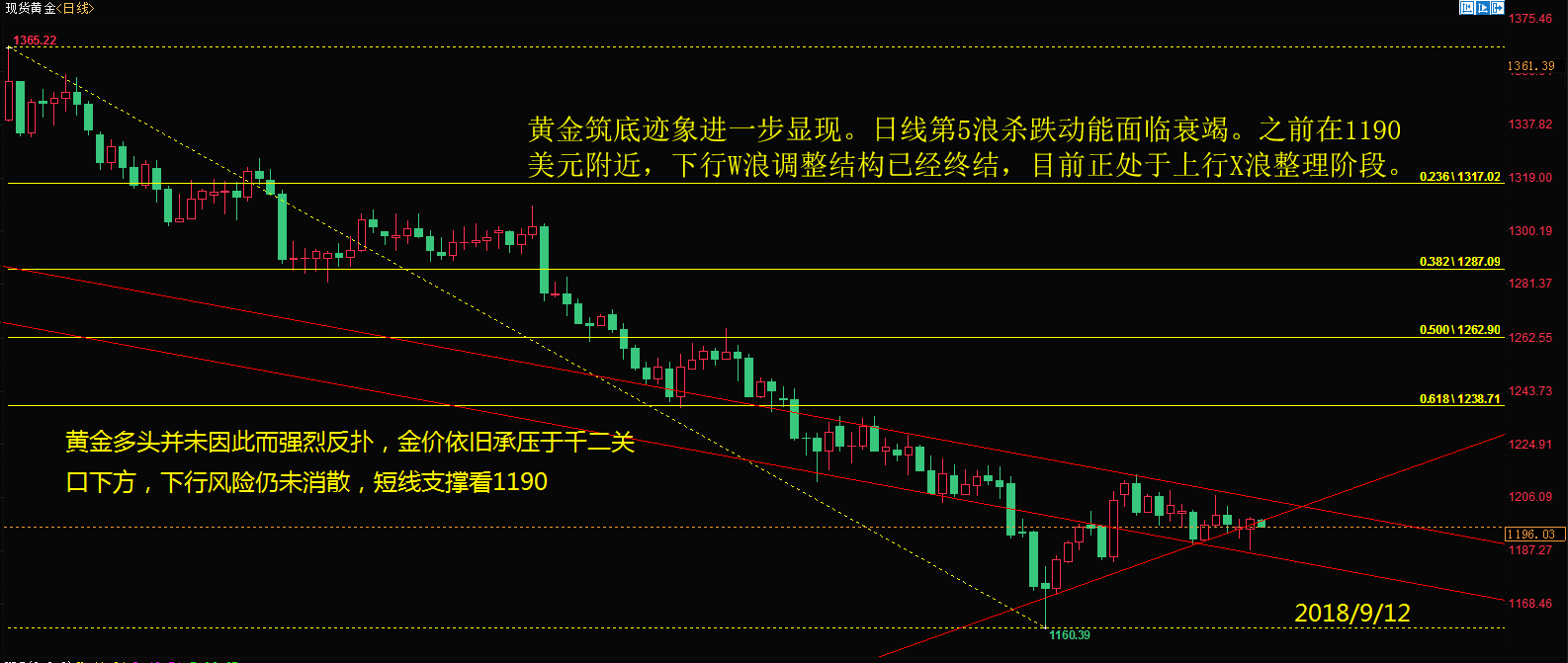 周二(9月18日)美元回升,美元兑日元升至两个月高位,兑欧元小幅上升,因投资者看似未理会美国和中国之间的贸易紧张局势升温,中国对美国对其商品实施新一轮关税举措进行报复的消息发布后美元上涨;美债也走高,提振美元,但打压金价。昨日因迹象显示OPEC不准备增产,以解决伊朗供应收紧的问题,且沙特暗示非正式目标接近当前的水平,导致油价上涨1%。 周三需要重点关注日本8月商品贸易帐、日本央行利率决议及央行行长黑田东彦讲话、英国8月PPI与CPI、英国8月零售物价指数、美国第二季度经常帐、美国截至9月14日当周EIA原油库存变动、欧洲央行行长德拉基在欧洲经济论坛讲话内容。 ——黄金行情分析—— 黄金 日线