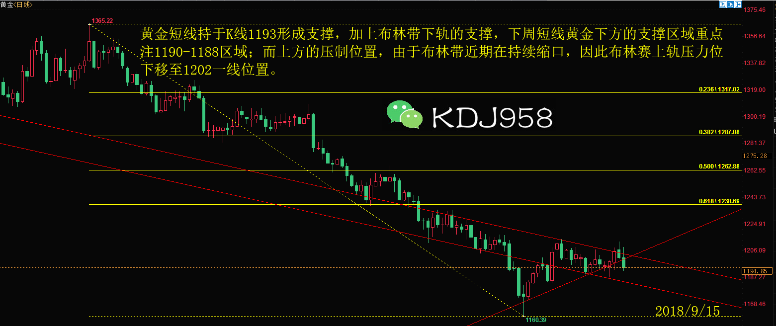 近期以来,由于新兴市场货币面临贬值压力,再加上美联储的加息预期,每当市场出现风险事件时,资金往往会选择买入美元资产避险,这反过来令金价走势与避险脱钩。而在贸易战阴云之下,外加上近期美国和亚洲遭遇的风暴灾害,令市场风险偏好低迷,全球股市普跌,这也同样令黄金价格继续承压。 9月17日(周一)美元下跌,因欧元和英镑受脱欧乐观情绪提振走强。黄金连跌两日后上涨,受美元下跌和空头回补通胀,投资者为美中贸易紧张局势升级作准备,部分买入黄金避险。油价几无变动,因市场揣摩美中贸易紧张局势加剧或将削弱全球原油需求,以及对伊朗的制裁可能令供应收紧。 ——黄金行情分析—— 黄金 日线图来看布林带缩口后,日K线短期