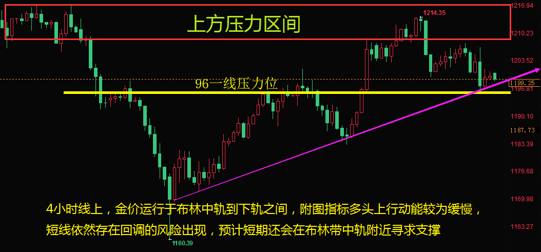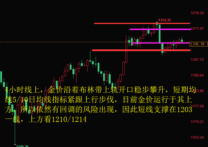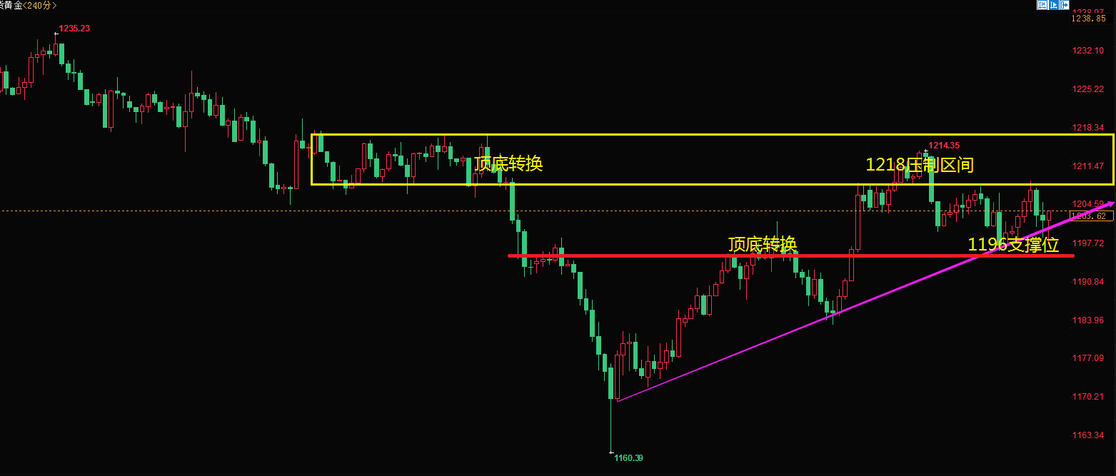 周五(8月31日),现货黄金价格上涨,投资人为应对可能的股市下跌风险而进行对冲,1200美元是一道强劲的支撑位。不过,黄金料录得自2013年以来持续最久的月线跌势。 本周美元总体走势偏软,但随着美国7月核心PCE物价指数公布,美元结束了本周持续收跌的状态,有所反弹。回顾本周,北美自贸谈判取得进展使得避险情绪回落是使得美元回落的重要原因。但随着美国基本面依然呈现出强劲的势头以及油价不断走高加剧了新兴市场的经济压力,进而推动美元走强,并施压金价。 ——黄金行情分析—— 晚间美盘行情方面经历前两日的一个窄幅震荡,今日还是有一波小高潮,下方区间支撑1198-1200确立有效,震荡几日,最终还是依托这