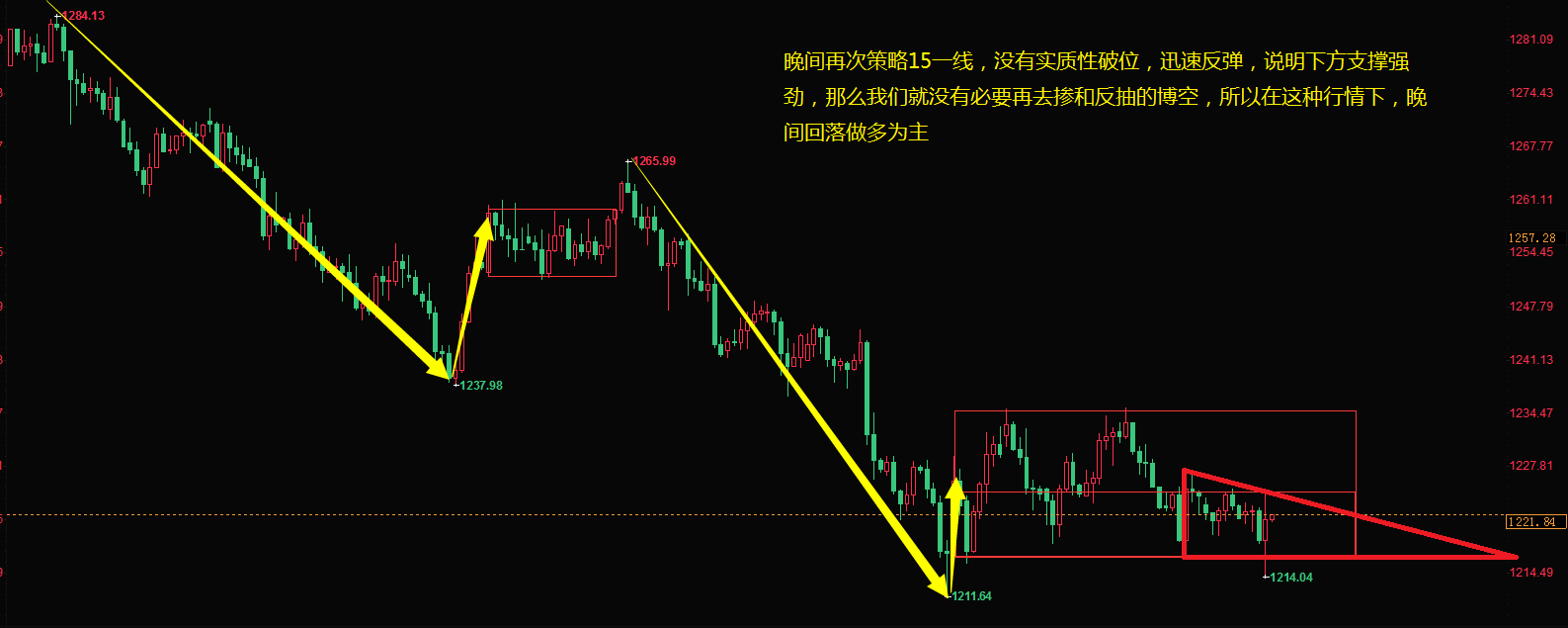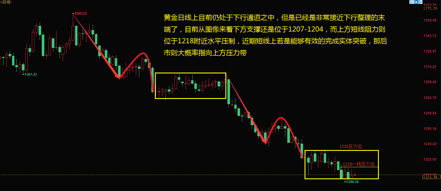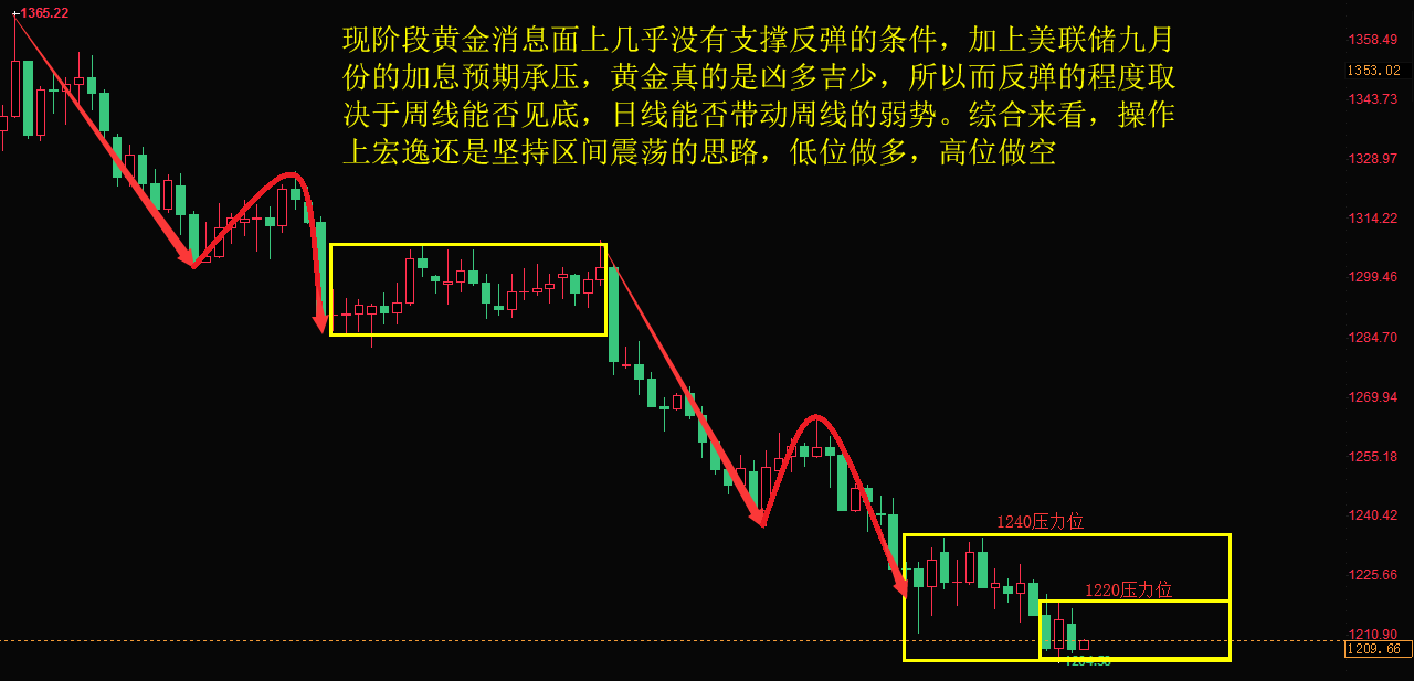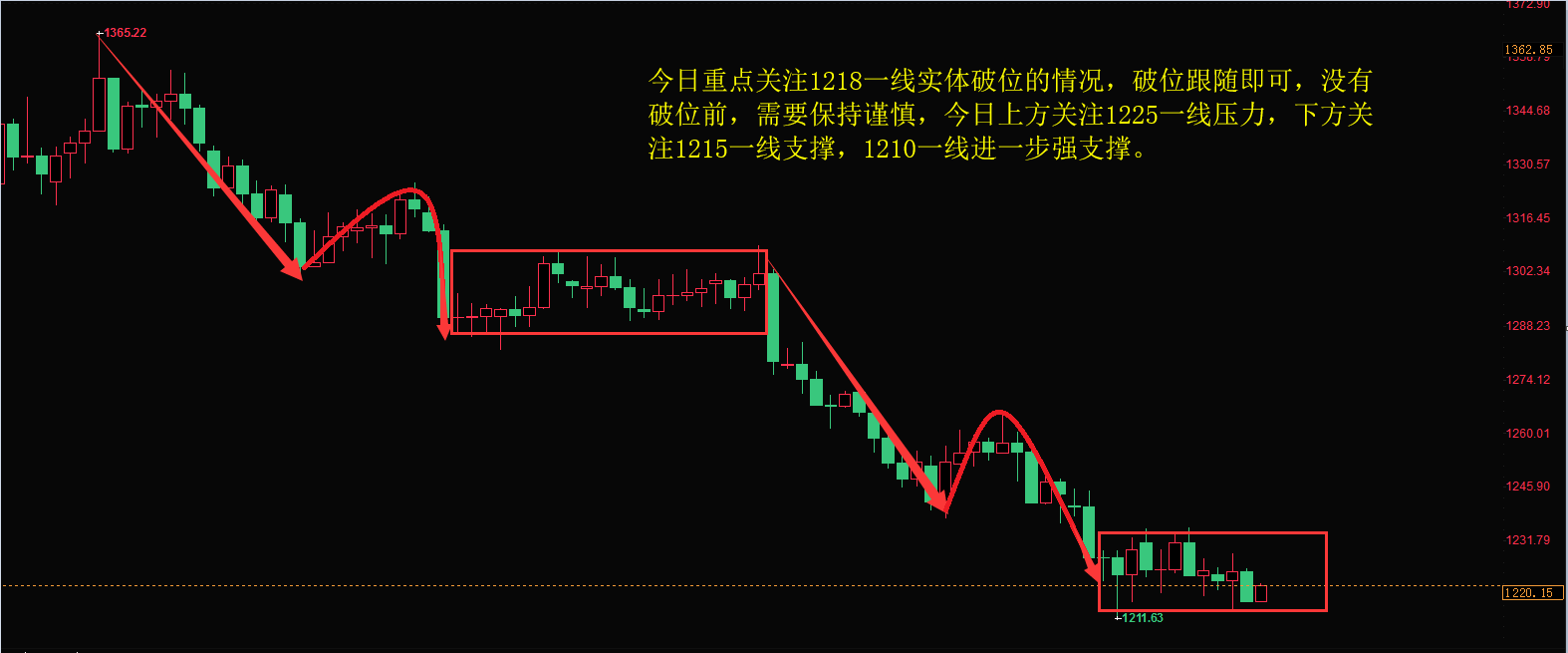 ——国际基本面—— 周一(7月30日),现货黄金探底回升,因美元指数在欧洲时段走疲,延续上日跌势,上周四录得的巨大涨幅遭半数回吐。市场对创下近四年最快增速的美国二季度GDP数据不屑一顾,认为贸易战开打前的数据被人为扭曲,而之后美国企业未来扩张欲望会下降。不过金价仍囿于上个交易日形成的区间范围内。 本周有包括美联储在内的多个央行将先后公布新一期利率决议,且备受瞩目的美国非农数据也将出炉,因此市场参与者在周初保持相对克制。 ——黄金行情—— 周一开盘亚盘如期出现回落,但力度不佳,弱势的形态一定是不断破低,不能长时间围绕支撑位运行,欧盘反复企稳在1220位置,这种走法难以放量,不利于空头下跌,欧盘