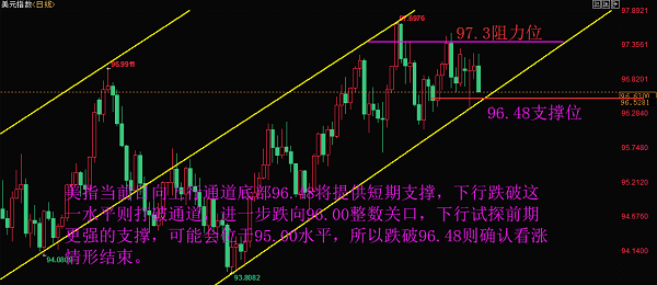 北京时间12月7日(周五)21:30,美国公布11月非农就业报告。11月非农数据不及预期,意味着美联储有可能暂停加息,这令美元承压。黄金再次创新高,美指再次下行试探94.38支撑位。 上周美联储主席鲍威尔表示,美国利率正接近中性水准,市场将之解读为升息放慢脚步的讯息,近期美元疲软,市场益发臆测美联储可能即将暗示将暂停持续三年的升息周期,另两年期美债收益率周二升至高于五年期美债,为逾10年来首见,再次提升了对于美联储准备暂停升息的预期。 市场将此解读为暗示升息脚步将放缓,自此之后美元便承压,美指当前运行于96.7一线,日线不断试探上行通道底部96.48将提供的短期支撑,若进一步下行跌破则将打破