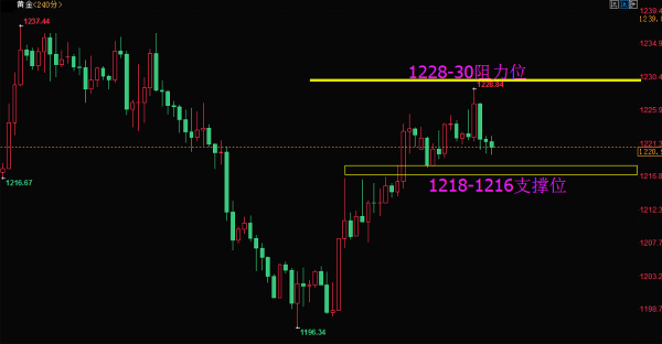 ——黄金行情分析—— 周一(11月26日)黄金价格上扬,对全球经济增长放缓的担忧以及围绕美国利率路径的不确定性,提振了黄金的买兴。黄金早盘开始反弹,日内最高涨至1228一线开始下跌,价格目前仍然处于1220--1230区间宽幅震荡中,而1228/30区域属于强阻力区域,短线来看上涨动能不足,难以突破,下方一点刺破阻力位则金价可能会进一步跌向布林线下轨1204.27附近。 从4小时上来看,黄金短线并无明显趋势性走势,尽管美元指数的反弹使得黄金承压下跌,各项指标趋于平稳,指标趋于平衡,金价倾向继续窄幅震荡,晚间依旧依托1228看空。晚间后市重点关注日内收线情况,日间最低1222.19美元,若日线