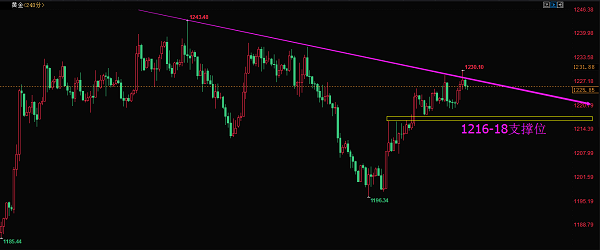 周三(11月21日), 在美元回落和股市表现疲弱的背景下,黄金在感恩节假日之前的清淡交投中小幅上涨,晚间各种数据利多,黄金不负众望涨起来了刷新短期新高1230.1后开始回落,上一交易日加上在美联储升息的背景下中美持续贸易对峙,风险偏好恶化以及全球股市大跌促使交易员重新追捧避险美元,使得美指从稍早触及的两周低位96.025回升。 但必须看到,美元在过去一周的多数时间里承压,因美联储官员发表谨慎评论,且美国经济数据意外疲软,暗示美联储可能放慢收紧货币政策的脚步。而美国政界和商界不少人对美联储存在负面评价,导致不少投资者押注升息周期接近尾声。 ——黄金行情走势分析—— 黄金今日探高回落收跌,日间亚