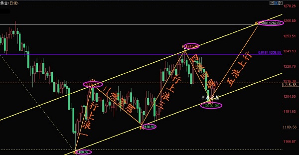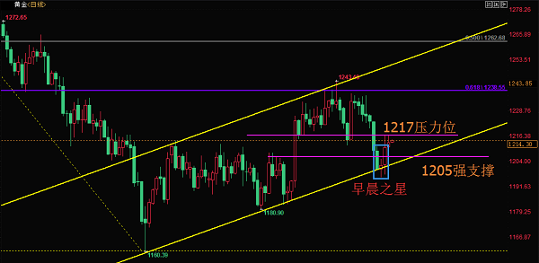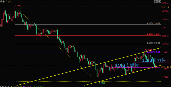 周三(11月14日),英国与欧盟就脱欧草案达成共识,但日内需重点关注英国内阁开会审议脱欧协议草案。如果同意签署该协议草案,下一步就是让欧盟领导人在本月底的会议上批准该协议。英国与欧盟就脱欧协议草案达成一致促使欧元和英镑近期止跌回升,美指高位承压投资者对美元进行获利了结。 日内美元指数预期回调修正,目前徘徊97关口附近,黄金价格小幅下挫到98一线开始反弹,短线持稳于1200上方,接近一个月低位附近徘徊。不过脱欧协议草案还需得到英国国内的广泛认同,英镑反弹阻力明显,而欧元涨势还受限于围绕意大利预算相关忧虑,因此欧系货币仍有可能拖累金价。 ——黄金行情分析—— 黄金 早盘出现技术面反弹,盘中最高触