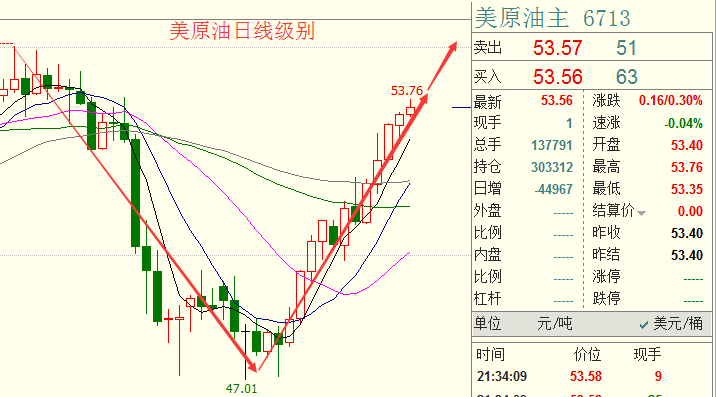 大涨行情不言顶,一波趋势的强势上涨没有人知道顶部在什么位置,任何一次无理由猜测趋势都是投资的大忌,是个人的主观意识,我们也跟随趋势而不是主观意识的去判断并交易,客观对待盘面尊重事实,顺趋势交易者才可以笑到最后。原油前期的高点是53.60美元,晚间老师认为触及53.50会有个小回踩,这次回踩便是我们做多的机会,