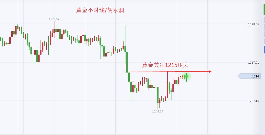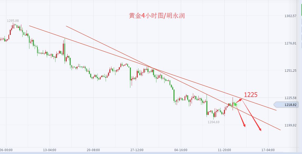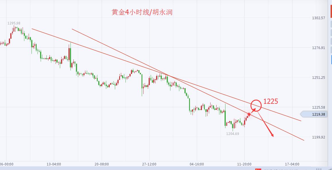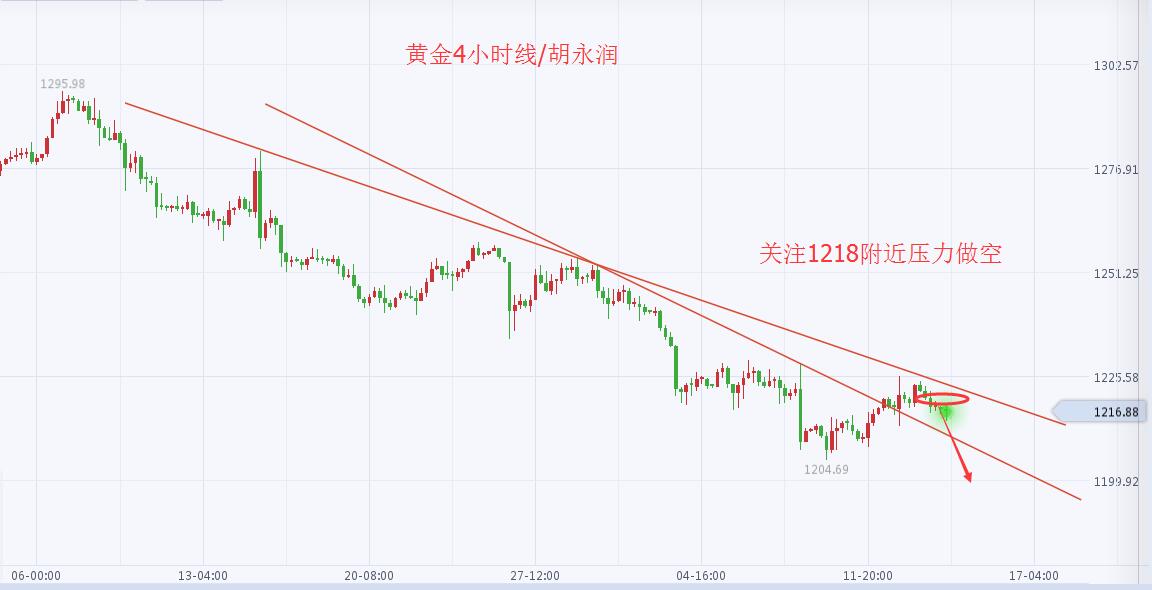 文/胡永润 黄金近期延续着下跌的态势,似乎多头已经放弃了抵抗的力量,上周的大非农成功打破了震荡的僵局,那么从日线级别来看,黄金跌破颈线位置,也就是说明黄金将会进一步走低,趋势上仍然是偏空运行,并且多周期共振,黄金目前反弹高空仍然是主思路,胡永润昨日早盘直接1213.5做空,到达12.7一线获利,跟随趋势,顺势而
