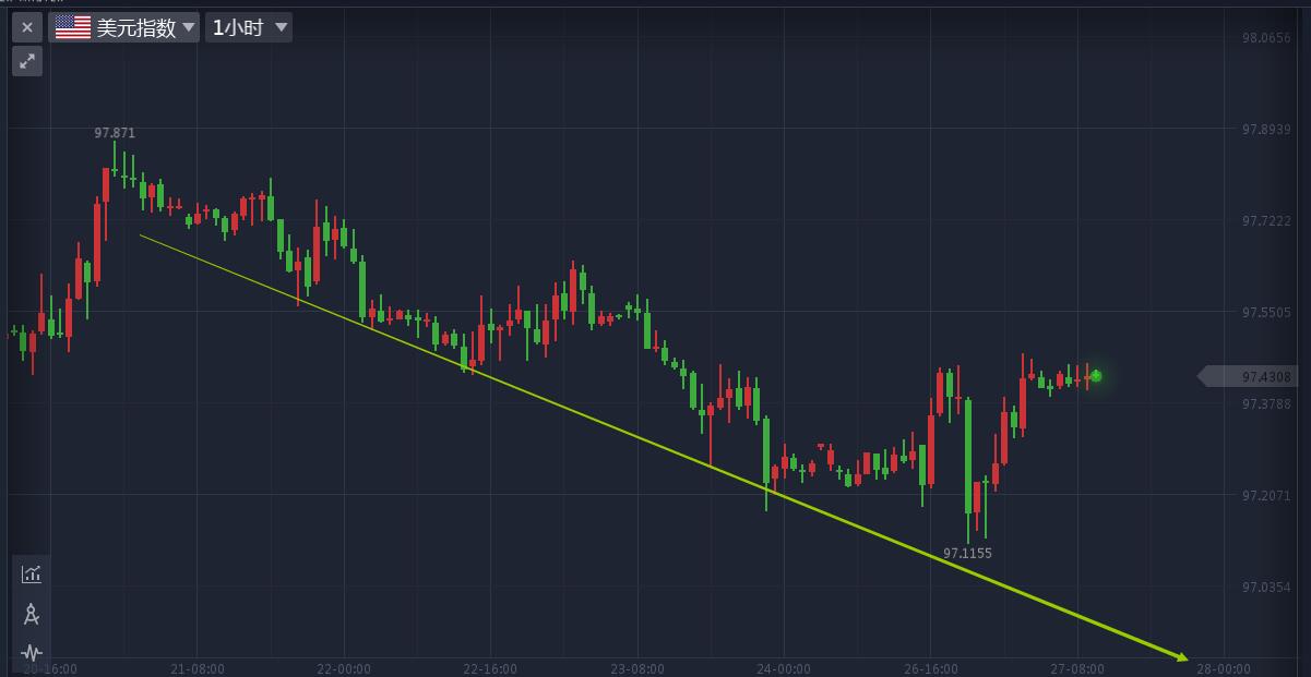 文/胡永润 美元指数 上周五(6月23日)美元指数震荡走低,录得3周来最大单日跌幅,因美国通胀数据持续走软,令市场对美联储(FED)年内能否再度升息的疑虑挥之不去。 美指上周初如预期的延续反弹,去测压98一线,但是60日线终结了短线反弹。此外部分美国数据表现不佳,引起市场质疑美联储的加息进。致使后半周美指连续回落