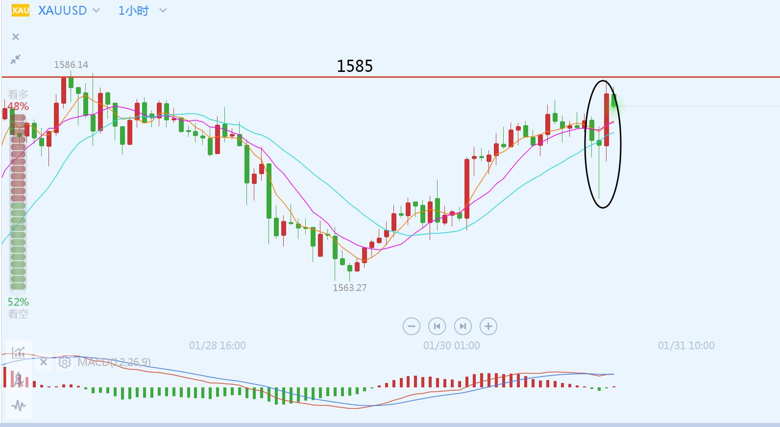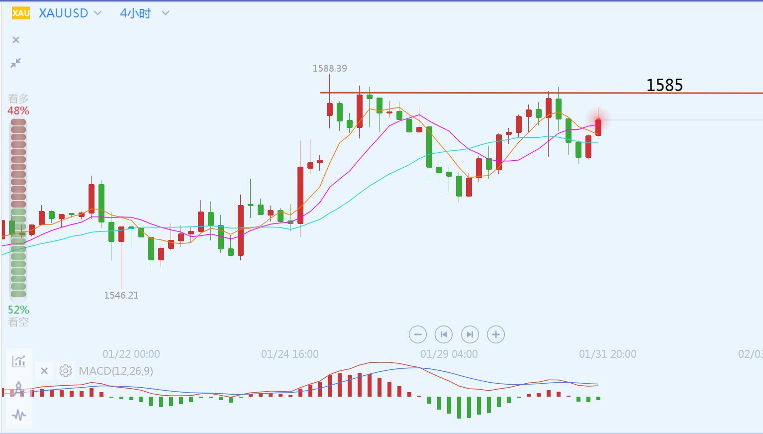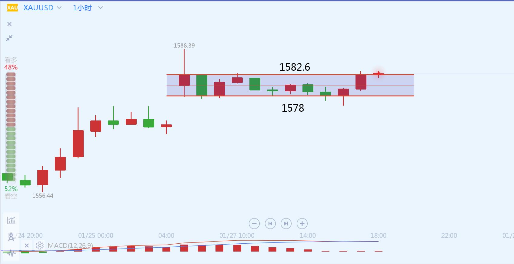 文/胡永润 今日黄金跳空高开,刷新1月9日以来新高至1588美元/盎司,因亚洲公共卫生事件以及美国驻伊拉克大使馆遭袭,市场避险情绪升温。 黄金开盘跳空后持续回落,下午达到日内低点1575.7后反弹,整体日内1578-1582.6区间震荡行情。上午的评论文章中我说道关注下方1575支撑,目前来看此支撑有效,价格在上方企稳,但是行情限制在区间中来回震荡。现在小时线级别有突破迹象,我们先观察18-19点的小时线收线能不能收在1582.6上方,如果突破区间,晚间跟多看1588,如果突破不了,那就又会回落。 黄金日线级别,上周虽然整体上行趋势,但是MACD指标都在0轴下方,今日跳空,但现在K线实体太小
